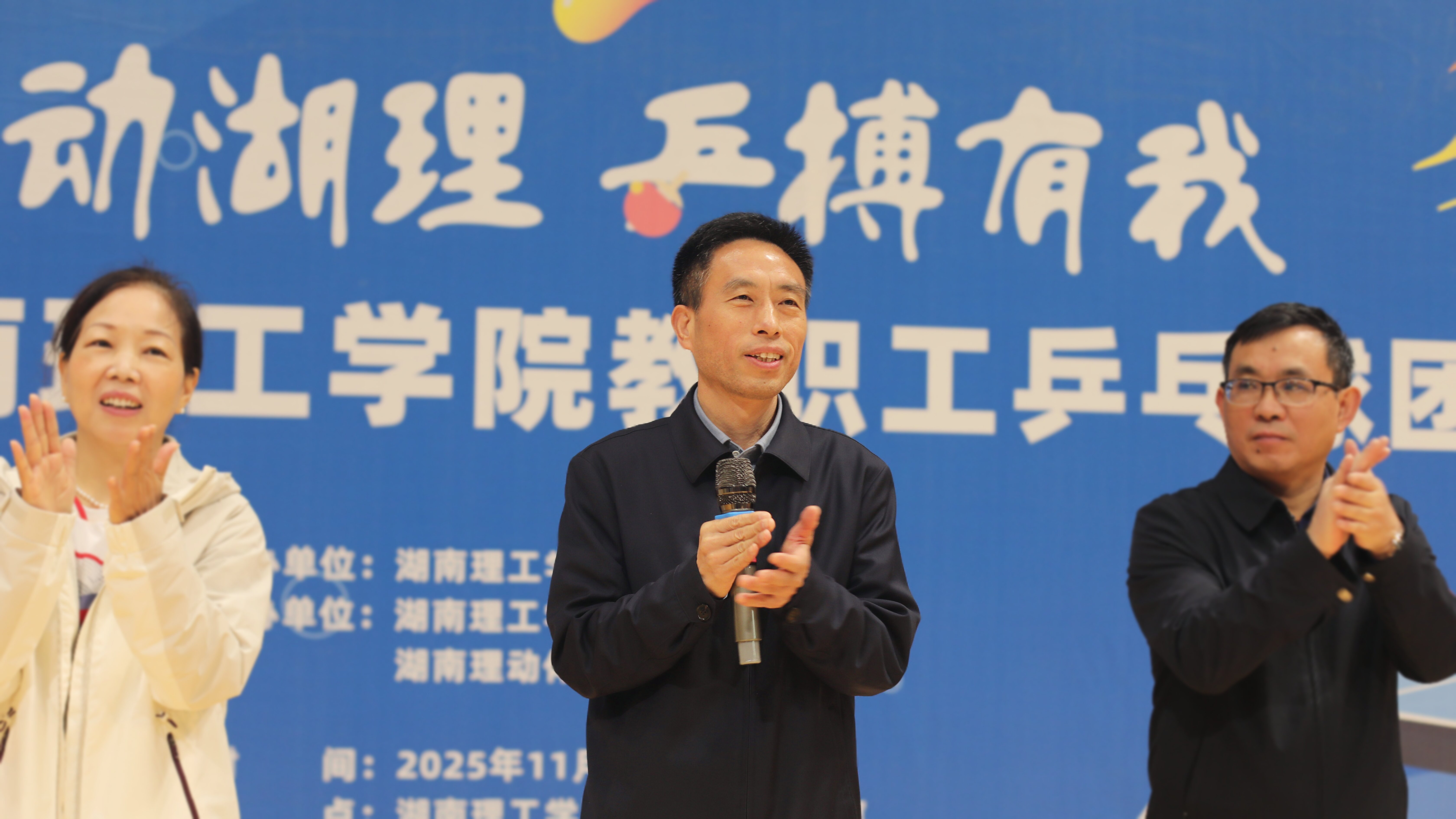 校党委书记张国云宣布湖南理工学院2025年教职工乒乓球赛正式开幕。