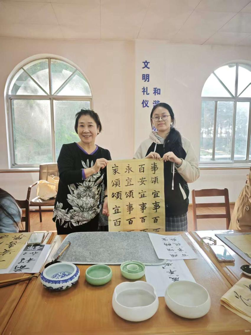铺纸、研墨、执笔,退休老教师在青年志愿者的陪伴和协助下凝神挥毫,宣纸上四溢的墨香勾勒出温馨的节日画面。书法专业的志愿者们用心、用情与老师们交流运笔技巧,笔锋流转间饱含了对老师们的敬意与感恩之情,在与志愿者主动交流艺术心得的过程中老教师们则展现出个人深厚的文化底蕴和人生智慧。当得知志愿者中有师范专业的学生时,退休老师刘敬龙感慨的说:“当年我在讲台教学生,如今你们用专业本领‘教’我们感受艺术,以后还要教育祖国的下一代,这就是传承”