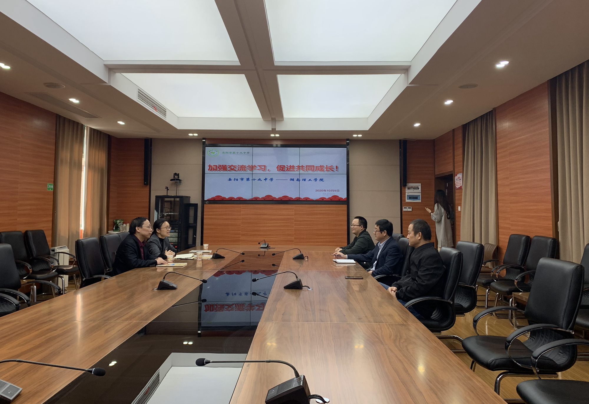 校园网讯 10月9日下午,教育科学学院院长刘理,中文学院院长曾炜一行赴岳阳市第十九中学,与该校校长陈辉华、书记黄强、副校长李杰商谈高校与地方基础教育合作、联合进行人才培养等事宜。