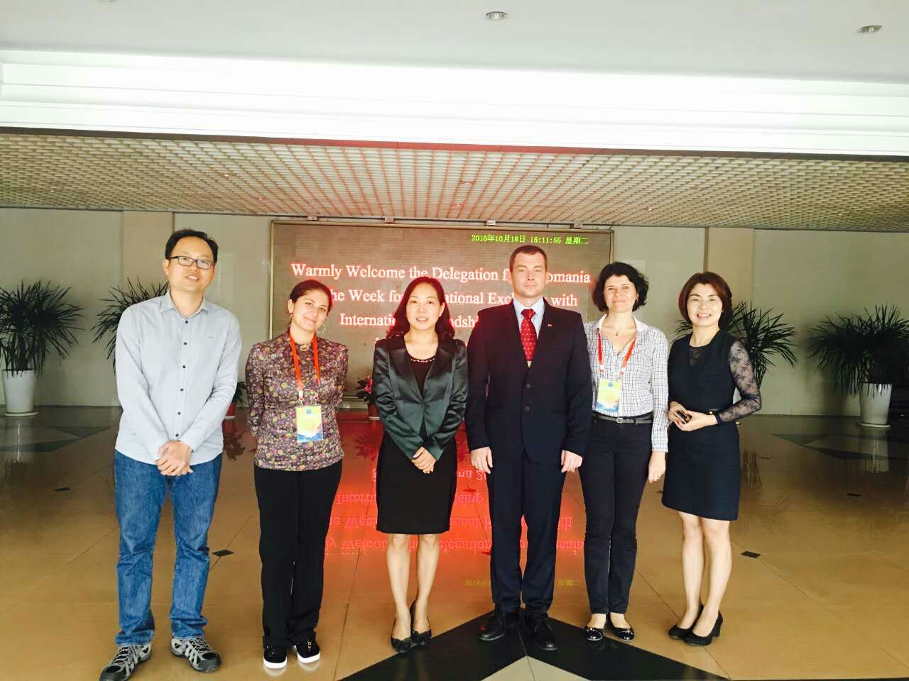 校园网讯 10月19日,湖南省国际友城教育友好交流活动周在长沙举行。18日下午,参加活动周的罗马尼亚代表团抵达我校,与我校进行国际友城教育友好交流,校长卢先明接待了代表团一行。交流活动在北院办公楼319会议室举行。副校长徐小立、国际交流处、外语学院负责人热情接待了克卢日纳波卡科技大学学科主任斯特欧潘·米哈伊(Steopan Mihai)、比斯特里察纳瑟乌德县郡立中学督学科拉普·坤娜·露米丽塔(Clapou Crina Luminita)、比斯特里察 纳瑟乌德县对外关系初级顾问亚历山德拉·亚美妮娜(Alexandra Armean)。