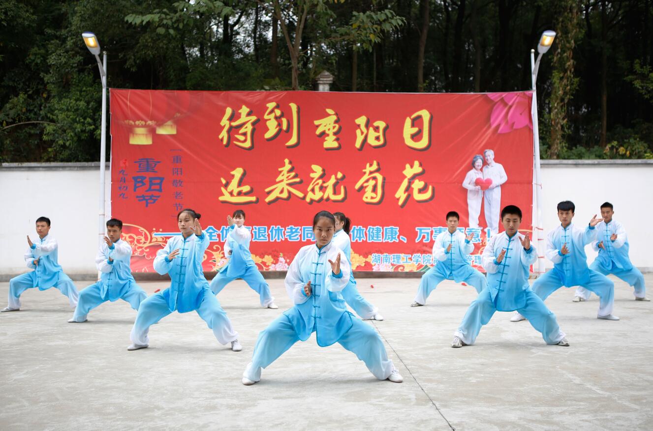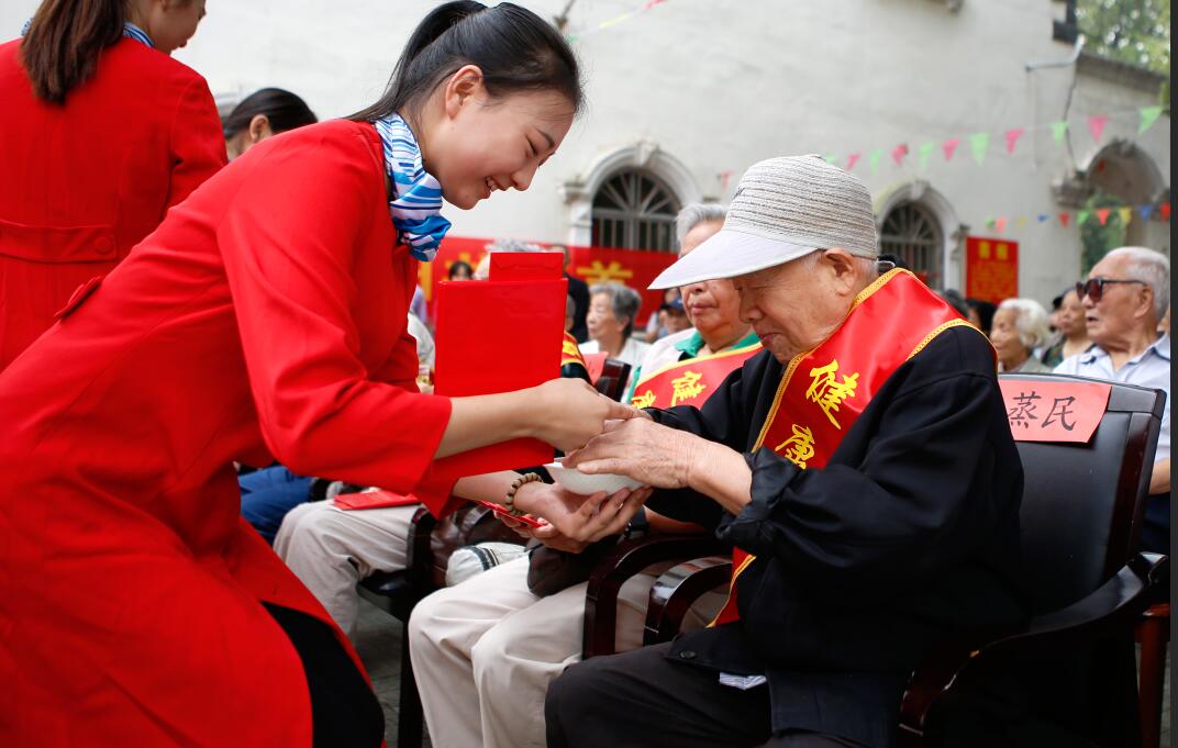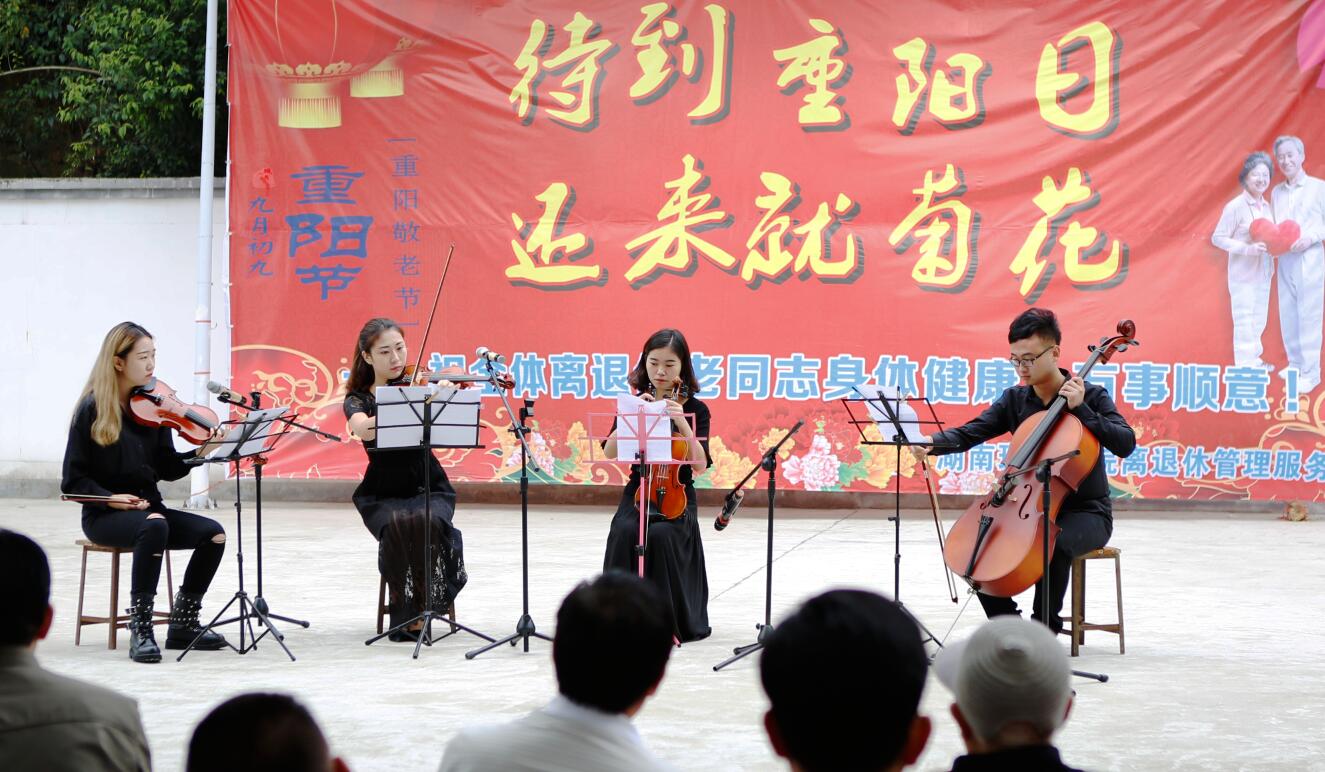 随后,学生志愿者为评选出的五位“健康老人”敬茶并佩戴条幅。音乐学院、体育学院师生表演的文艺节目获得了大家的阵阵掌声。
