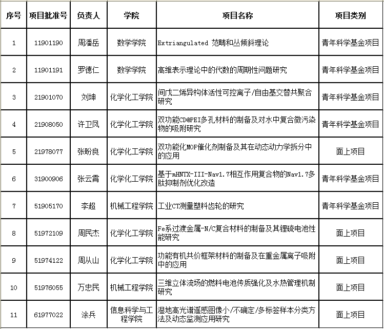 校园网讯 8月16日,国家自然科学基金委员会公布了2019年度国家自然科学基金项目评审结果,我校项目立项数和经费数再创新高,共有11个项目获立项资助(其中面上项目5项、青年项目6项,立项资助名单附后),直接经费450万元。