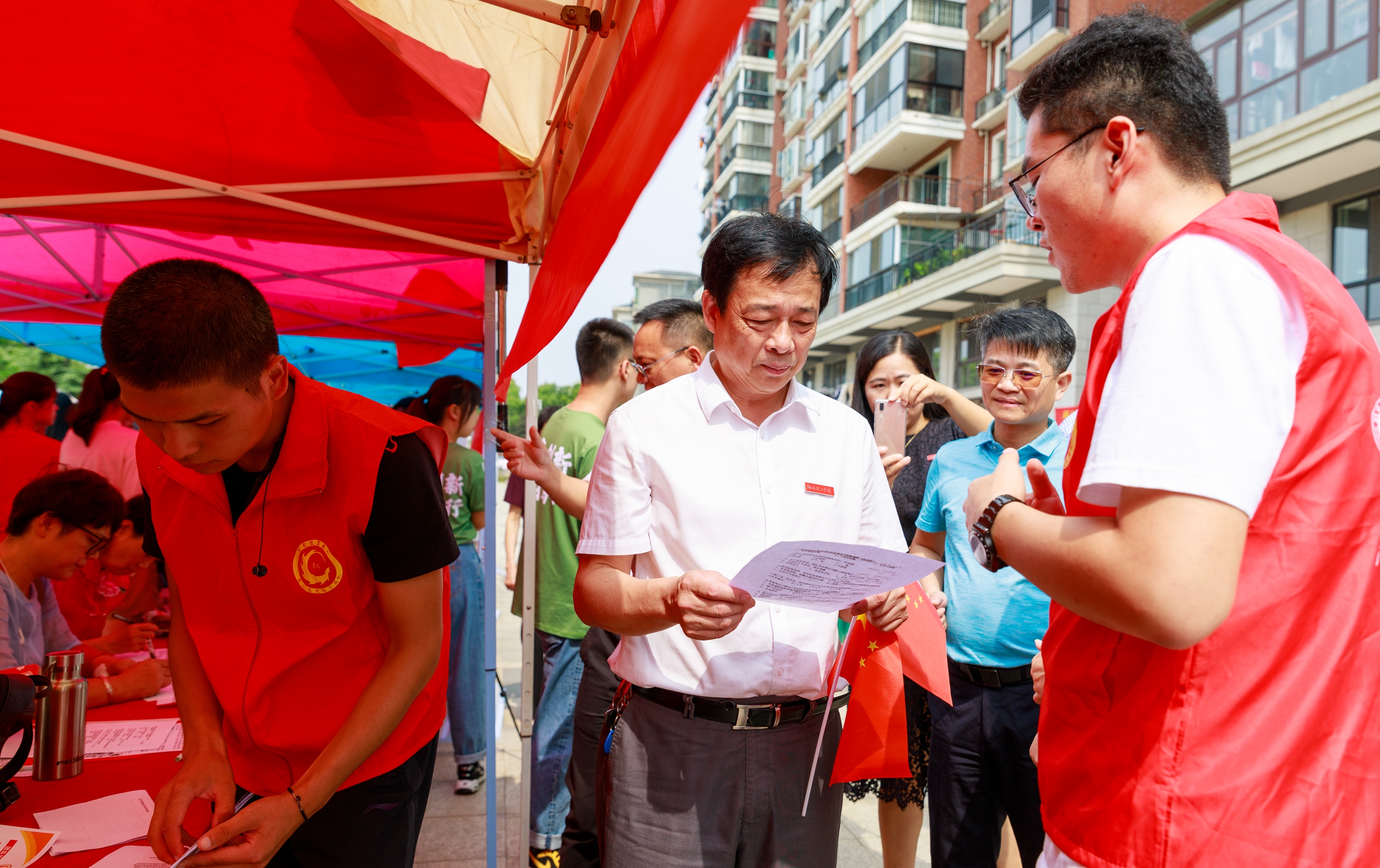 党委书记李明与南湖新区工委书记李运帷为社会实践重点团队授旗。
