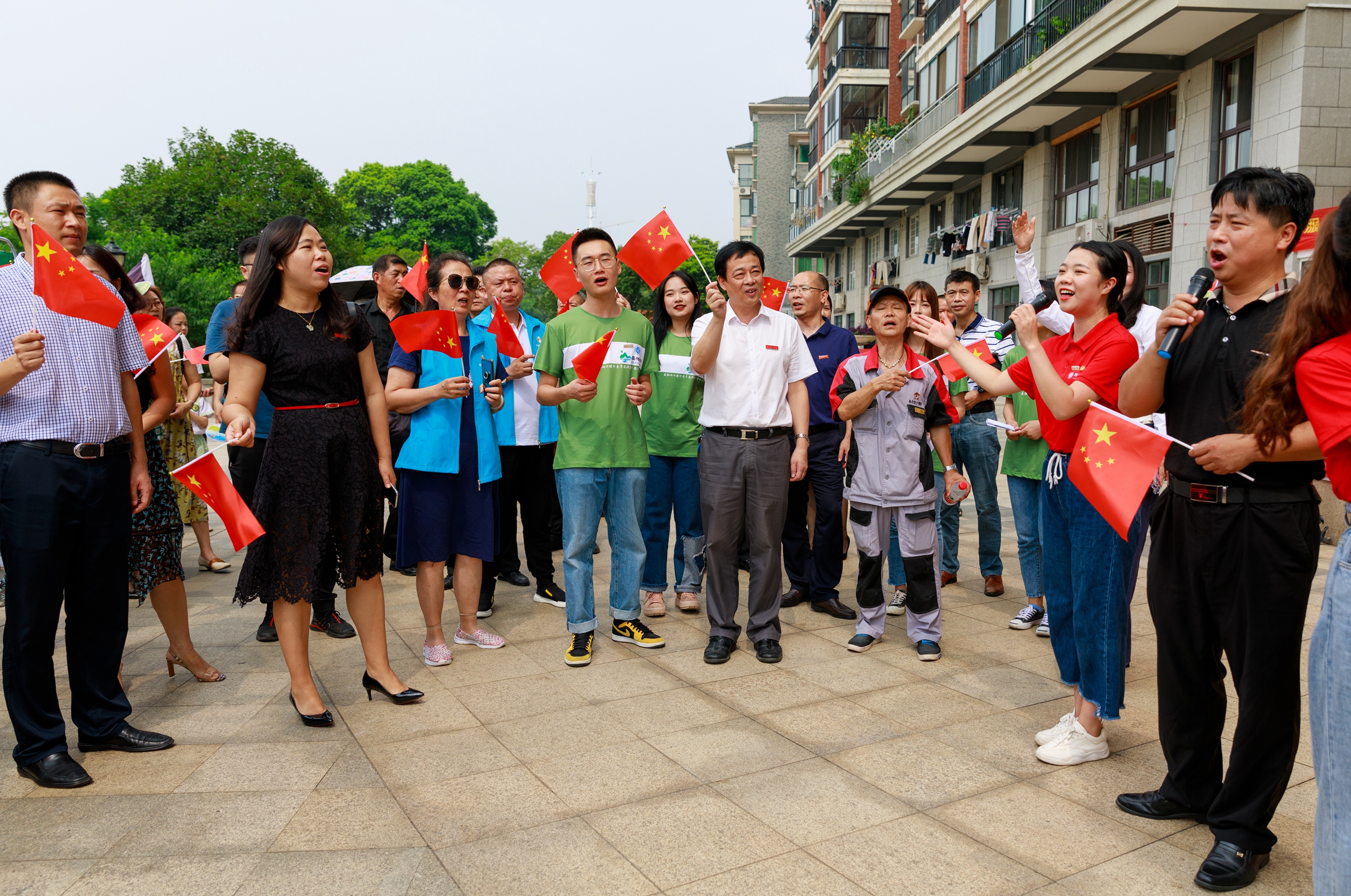在暑期“三下乡”社会实践活动现场,师生同唱《我和我的祖国》,快闪活动吸引了社区居民驻足观看,动情合唱。