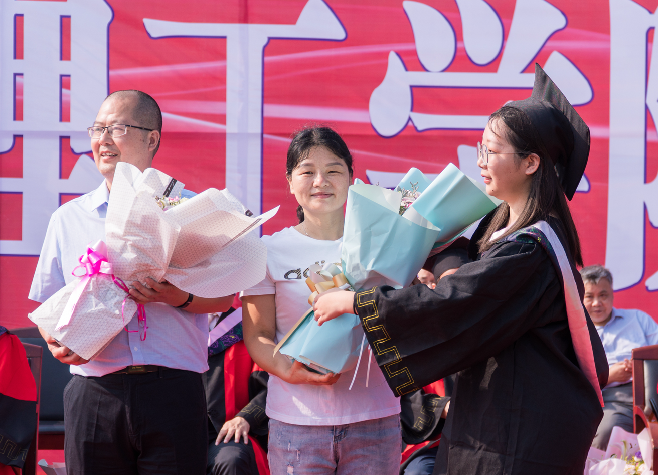 新闻传播学院15级新闻专业黄丹青的家长代表学生家长致辞,作为一名父亲,能见证女儿以优异的成绩开启新的里程碑,完成从青葱少女到心智成熟、人格健全的优秀大学毕业生的转变,他倍感骄傲。主席台上,他分享着女儿学以致用取得的专业竞赛成绩和社会实践成果,字里行间感受着她从做好自己到带好头,做好榜样的格局转变。他对老师们的言传身教和悉心指导致以深深的感谢,表示在孩子思想困惑、人生目标迷茫、学习生活遇到困难时,是她的辅导员曹玲老师、专业课老师唐定放下他们自己的孩子家人,挤占他们宝贵的时间给予了孩子无微不至的关心照顾和有力的支撑。
