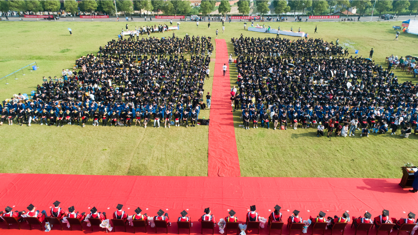 在毕业典礼的现场,清一色的硕士服、学士服直映眼帘,却有一块独立出来的区域,摆好的凳子上坐满了不同年龄层的人——这是学校特地为毕业生家人准备的休息区。