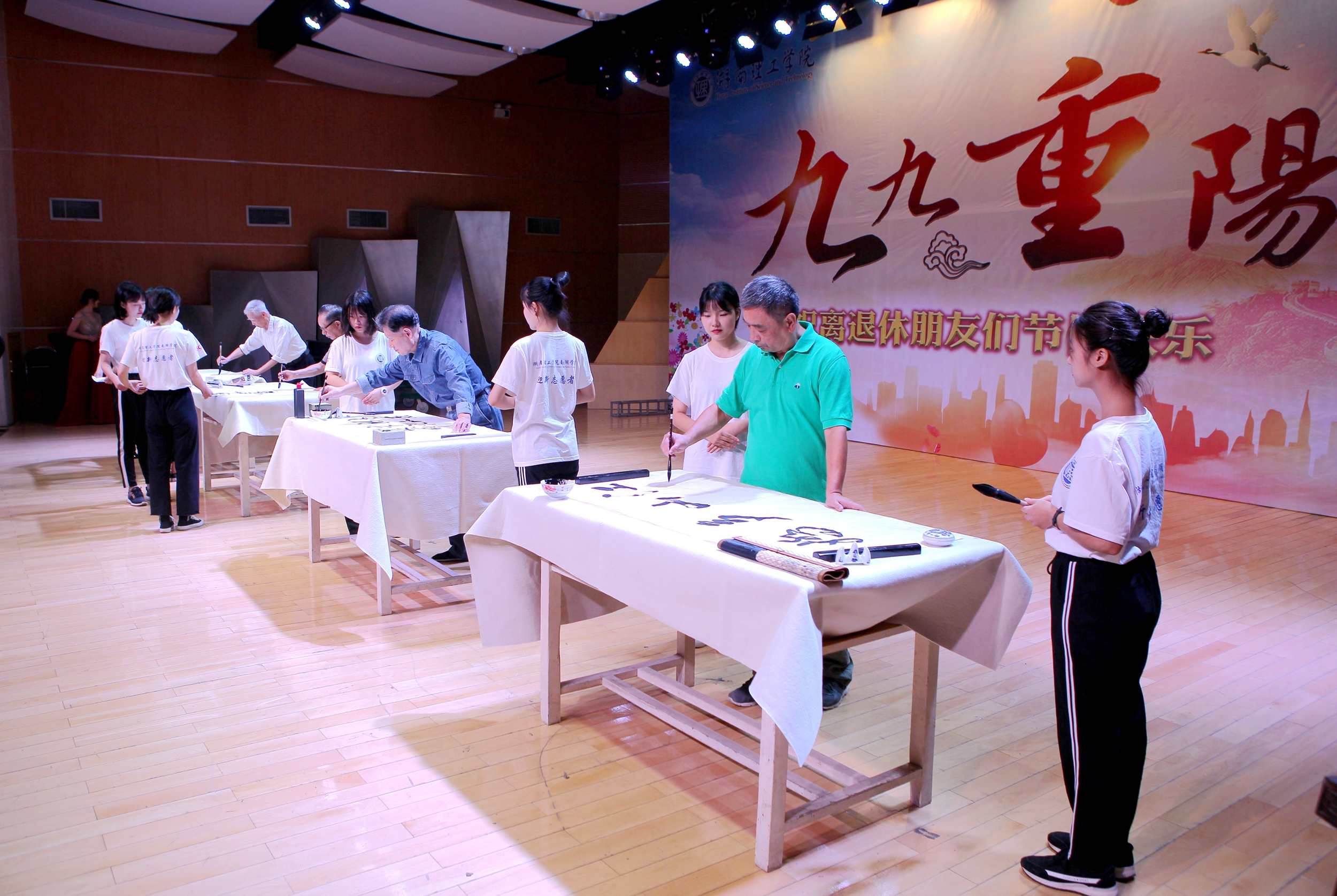 文艺表演中,音乐学院学生给全体离退休同志带来了多个极具民族气息的新疆舞、傣族舞和藏族舞表演,二胡表演“战马奔腾”和男女对唱《共筑中国梦》,点燃起了在座新老辈的爱国情怀,现场气氛热烈。 四位退休教师还现场挥笔泼墨,向祖国深情告白,以书画献礼,用笔墨抒情,为新中国成立70周年华诞喝彩。离退休同志自己组织编排的舞蹈更是点燃了现场的氛围。