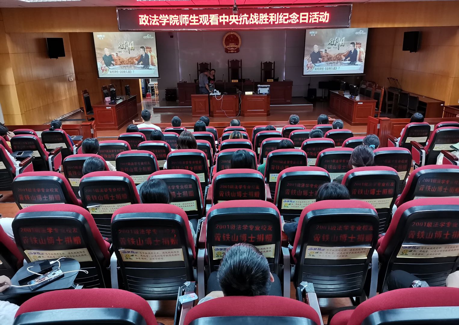 政法学院师生在模拟法庭观看抗战胜利纪念日活动,缅怀烈士、凝聚力量
