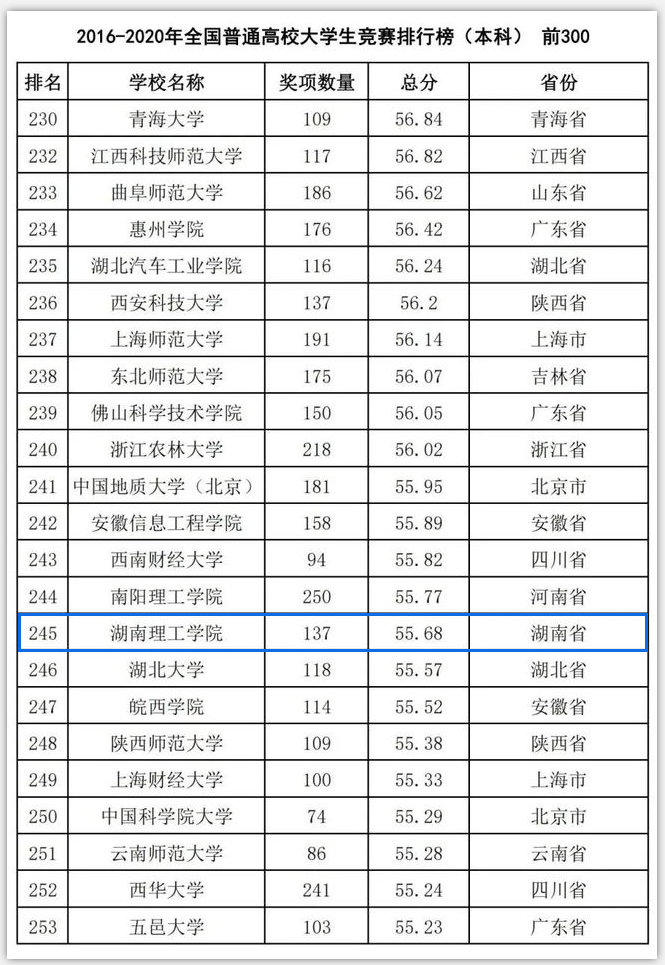 校园网讯 3月22日,中国高等教育学会高校竞赛评估与管理体系研究工作组发布2020全国普通高校大学生竞赛排行榜。榜单显示,我校在2016-2020年全国普通高校大学生竞赛排行榜中位列全国第245名,全省第10名,在全国普通高校大学生竞赛排行榜五轮总排行榜中列位全省第8名。