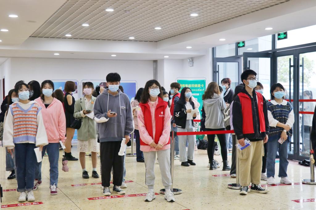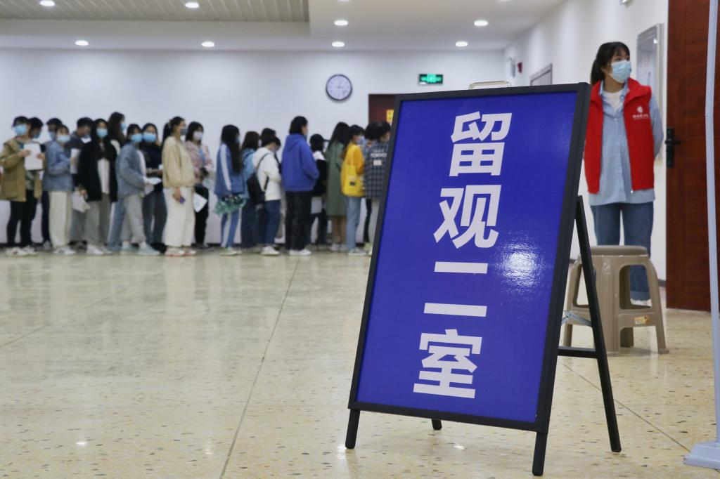现场共分为等候区、询问体检告知区、登记区、接种区和留观区五个区域。学生在志愿者的引导下先通过扫码测温预检分诊,在登记区出示身份证原件进行信息采集与电脑录入,实现每一支疫苗的可追溯。接种完毕,还需在留观区观察三十分钟,无其他不良反应后方可出示疫苗接种留观卡离开。
