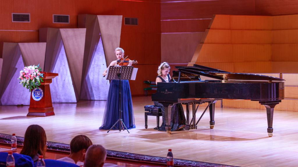 校园网讯 “悠扬的小提琴演奏一首首中国传统曲目,西洋乐器全新演绎中华古典”。5月27日,伴随着悦耳的小提琴声,熟悉的中国传统曲目,学校庆祝中国共产党成立100周年系列活动之“音乐里的中国”小提琴独奏音乐会在学校音乐厅举行。俄罗斯知名小提琴演奏家安娜•加宁娜、白俄罗斯知名钢琴演奏家卡佳•茹罗娃用西洋乐器演绎中国传统曲目,展现音乐里的中国印记。