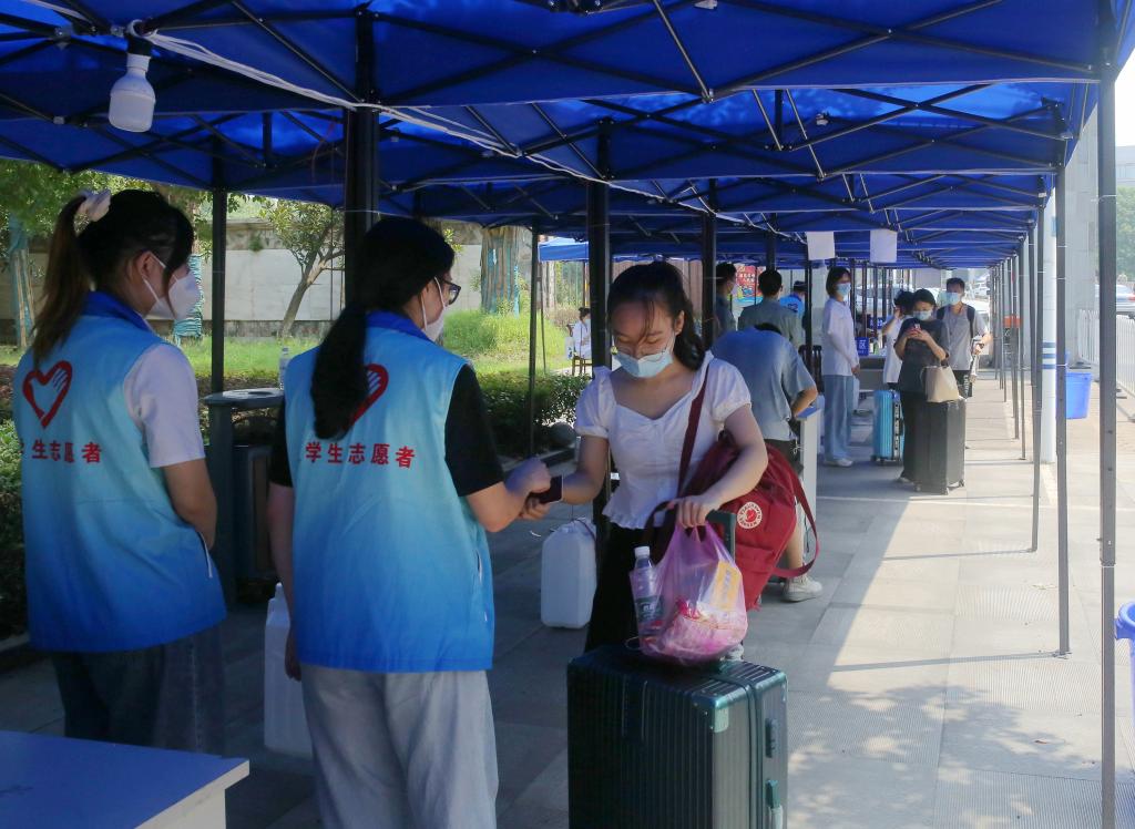 在进校通道,刚刚从新疆维吾尔自治区库尔勒市赶回学校的20级学生马钰洁表示,返校前,班级线上召开了防疫主题班会,介绍防疫形势、宣传防疫知识,辅导员悉心叮嘱要在旅途中做好个人防护。今天返校,看到很多大学生志愿者主动帮助进行行李消毒、搬运行李,感觉整个返校的过程爱心常在、温情满满。