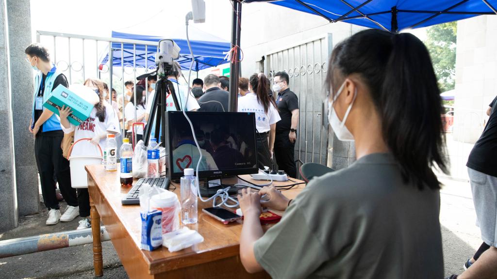 在迎新点等待新生到来的志愿者和老师们