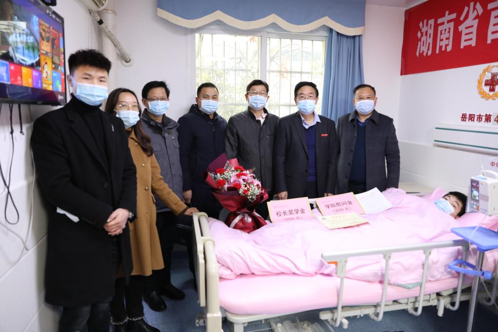 14号上午,湖南省红十字会副会长代贺龙,省造血干细胞捐献者资料库主任张赞,市政协副主席、市卫健委副主任任浩波,及学校校长宁立伟、学工部、化工学院负责人一行前往医院看望慰问他。在病床前,宁立伟竖起大拇指“点赞”黄宇航的爱心义举,叮嘱其好好休养早日恢复,并为他颁发了“校长奖学金”。