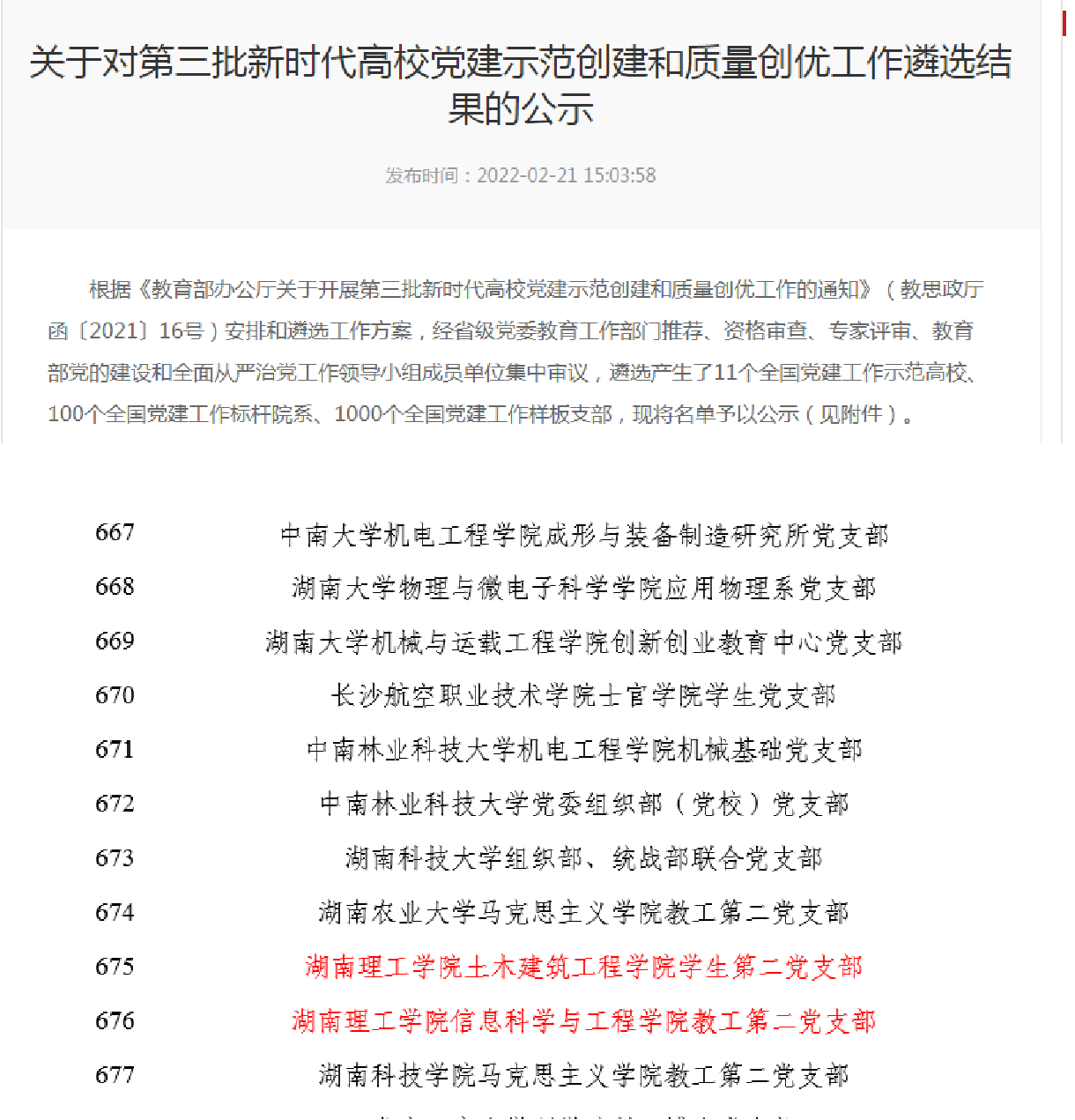 校园网讯 日前,教育部公布了第三批新时代高校党建示范创建和质量优创工作遴选结果,我校土木建筑工程学院学生第二党支部、信息科学与工程学院教工第二党支部入选“全国党建工作样板支部”。