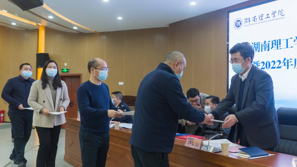 在随后举行的平安校园建设工作会议上,宁立伟传达了由湖南省安全生产委员会下发的《2022年全省安全生产工作要点》文件精神,徐振祥作《2022年度学校平安建设会议工作报告》。学校各单位签署并递交了《校园平安建设目标管理责任书》。