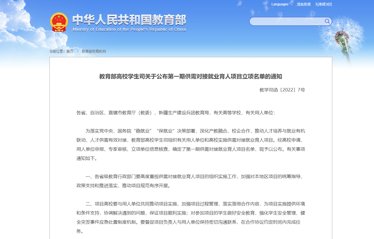 校园网讯 日前,教育部高校学生司发布《教育部高校学生司关于公布第一期供需对接就业育人项目立项名单的通知》(教学司函[2022]7号)。我校共有27个项目获批立项,其中就业实习基地项目20项、定向人才培养培训项目5项、人力资源提升项目2项。学校立项总数在全国立项成功的1268所高校中排名第36位,在省内高校排名第3位。