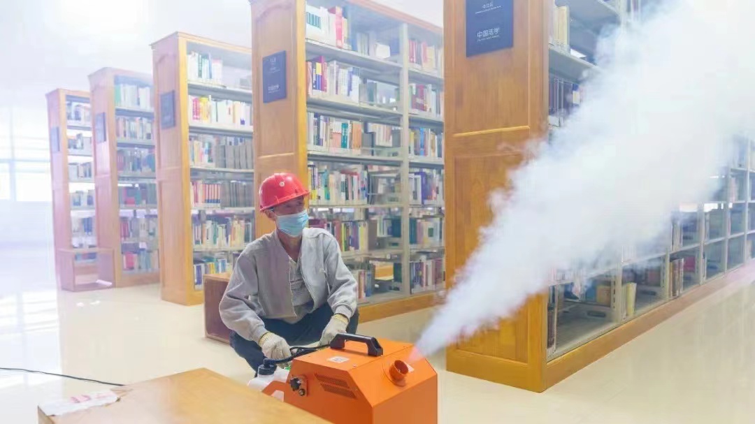 专业消杀团队正在对图书馆进行全面消毒消杀