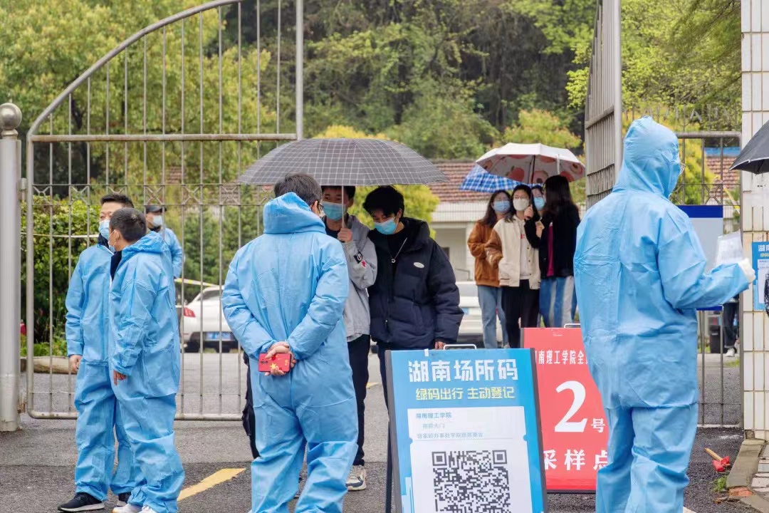 在校医院门口,身着防护服的教职工正在引导学生排队进行核酸检测