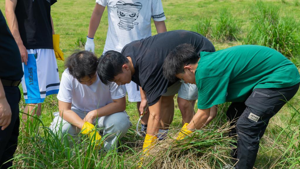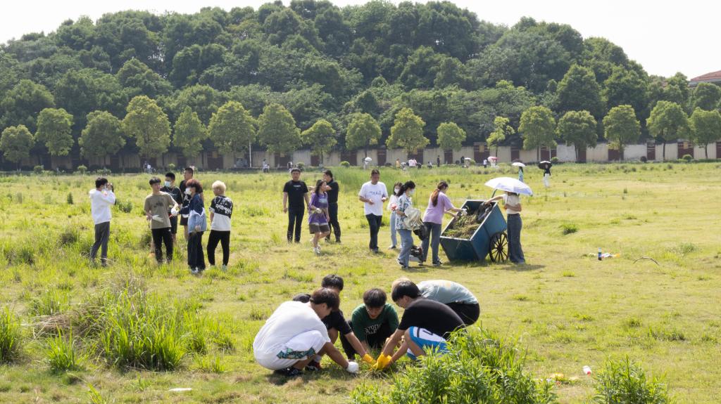 师生们头顶烈日,埋头于草坪杂草的清除之中,成为校园内一道靓丽的风景