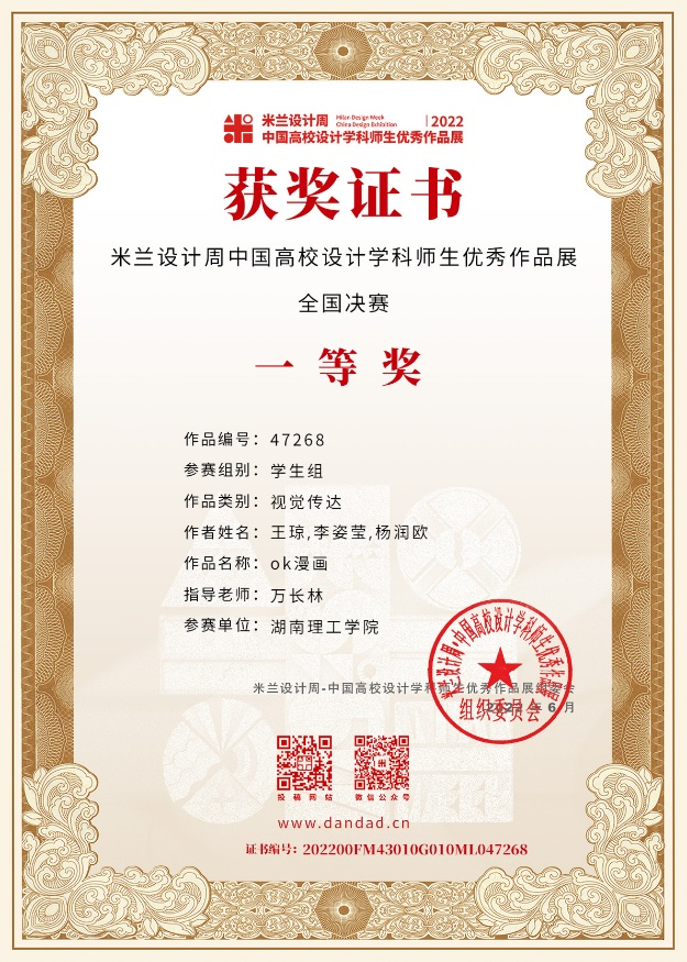校园网讯 近日,2022“米兰设计周——中国高校设计学科师生优秀作品展”(国赛)公布了获奖结果,湖南理工学院美术与设计学院学生在本届大赛中获得国家级一等奖2项、二等奖2项、三等奖5项。其中美术与设计学院张丽莉老师指导的柳燕、王华、万思岑团队创作的作品《印象岳阳》、万长林老师指导的王琼、李姿莹、杨润欧团队创作的作品《ok漫画》获得全国决赛一等奖,学校获全国优秀组织单位。