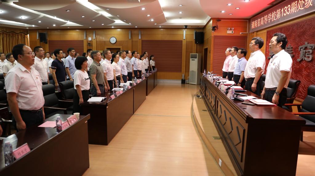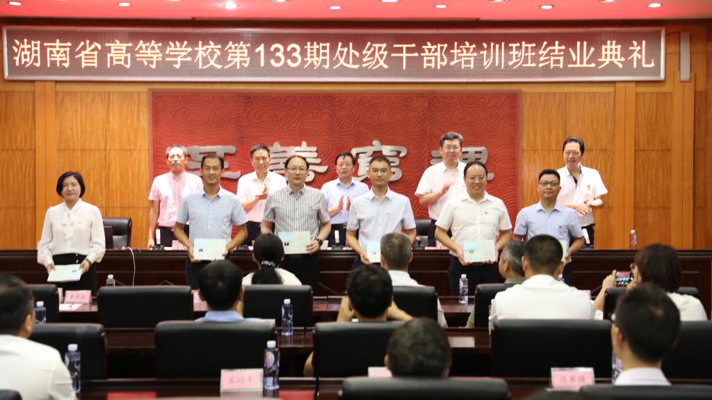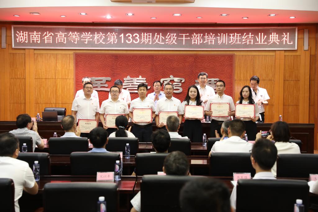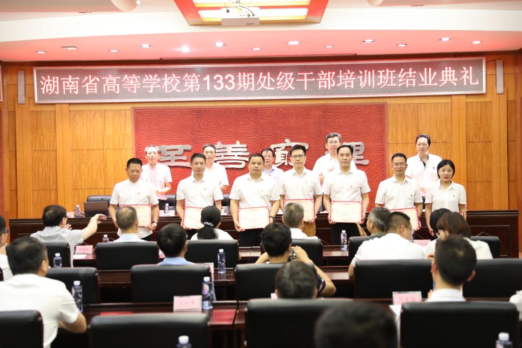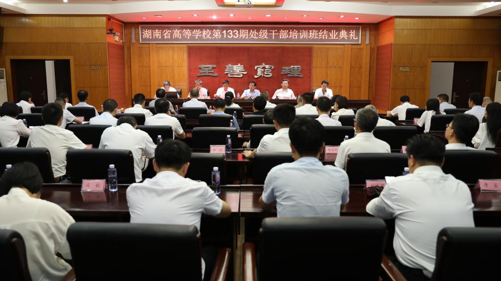 校园网讯 7月5日下午,湖南省高等学校第133期处级干部培训班暨湖南理工学院处级干部培训班在办公楼214会议室举行结业典礼。省委教育工委党校常务副校长、省高校干部培训中心主任、书记刘国华,省委教育工委党校高校干部培训中心教务部主任王青沅,校党委书记卢先明,党委委员、组织部部长刘创出席结业典礼。典礼由党委副书记张国云主持。