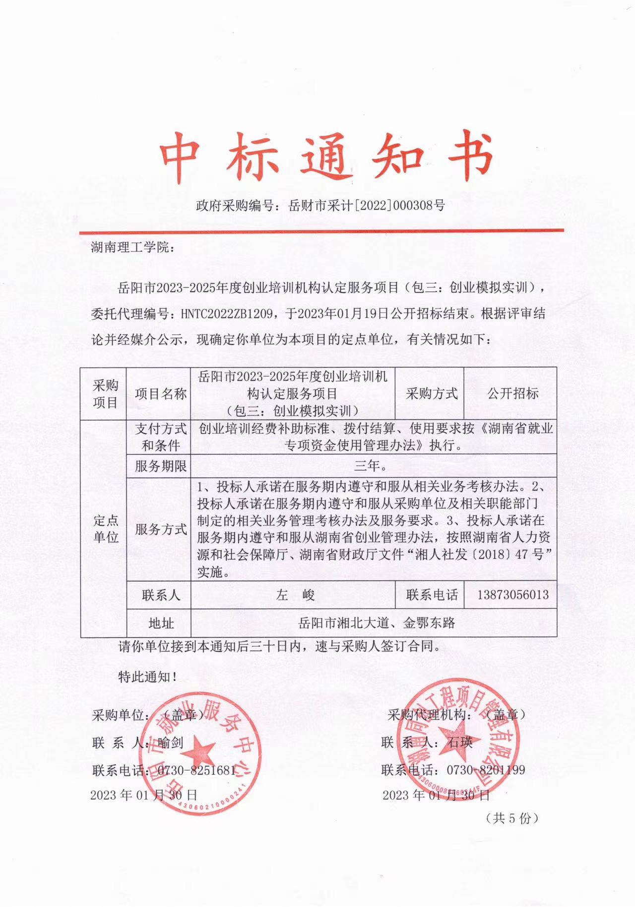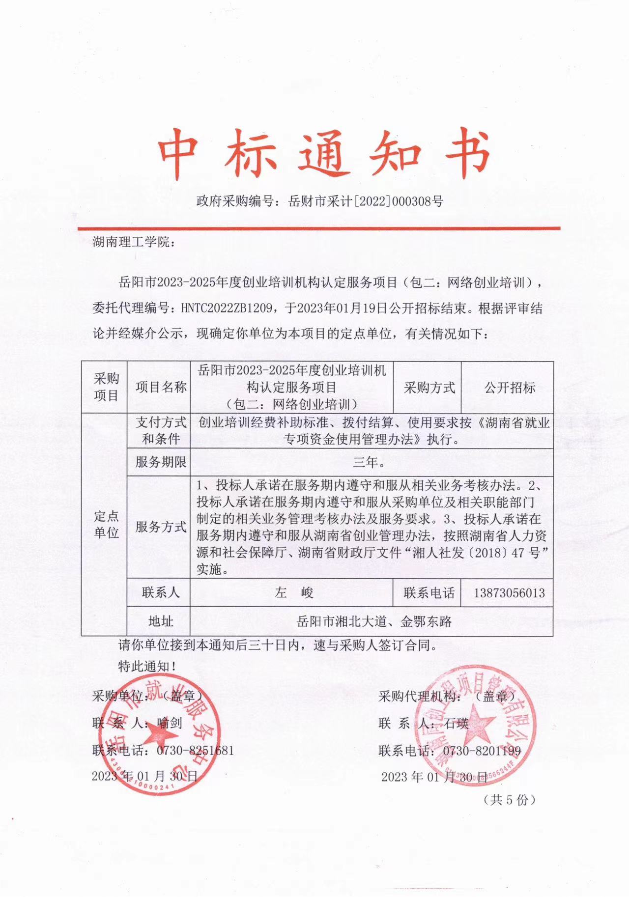 校园网讯 近日,依据岳阳市政府网关于2023-2025年度创业培训机构认定政府采购项目包中标公告,我校成功中标岳阳市2022-2035年度创业培训定点机构。