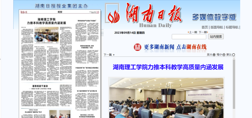 校园网讯9月14日,湖南日报以《湖南理工学院力推本科教学高质量内涵发展》为标题,在第15版观察栏目对我校本课教学工作进行了详细报道。