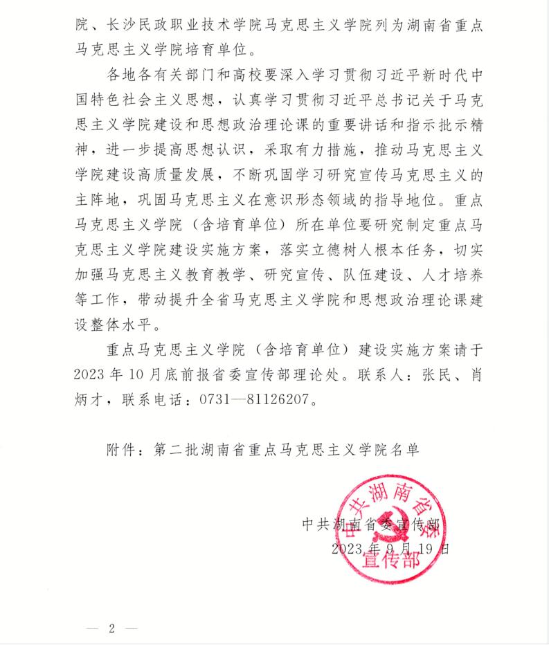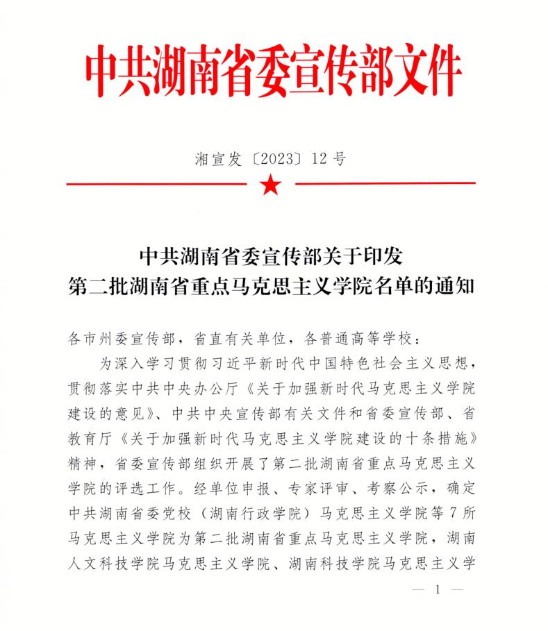 校园网讯 9月19日,湖南省委宣传部印发通知,公布7所第二批湖南省重点马克思主义学院名单和3所培育单位名单。我校马克思主义学院成功获批为重点马克思主义学院。
