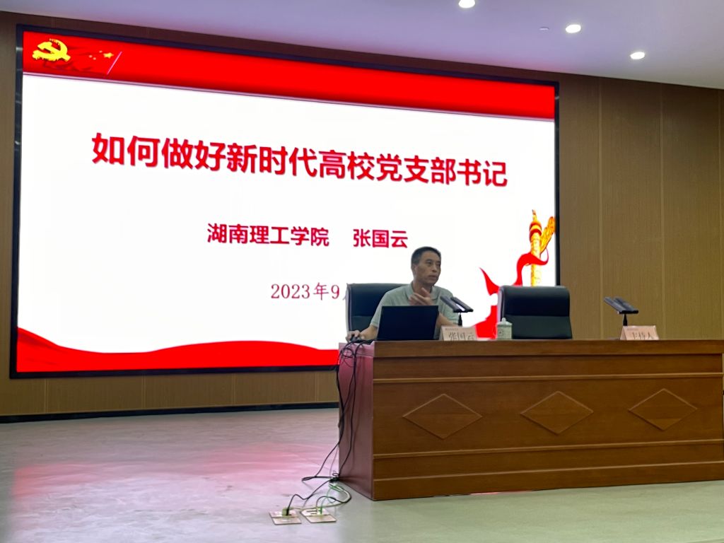 张国云以“如何做好新时代高校党支部书记”为题,对《中国共产党支部工作条例(试行)》《中共湖南理工学院委员会关于加强党支部书记队伍建设的实施细则》进行解读,他表示,全体党支部书记应以身作则,发挥思想引领作用;提高素质,切实做好“领头雁”;选准抓手,提升教学育人效果,不断提高思想政治素质和业务能力水平,增强党组织的创造力、凝聚力、战斗力。