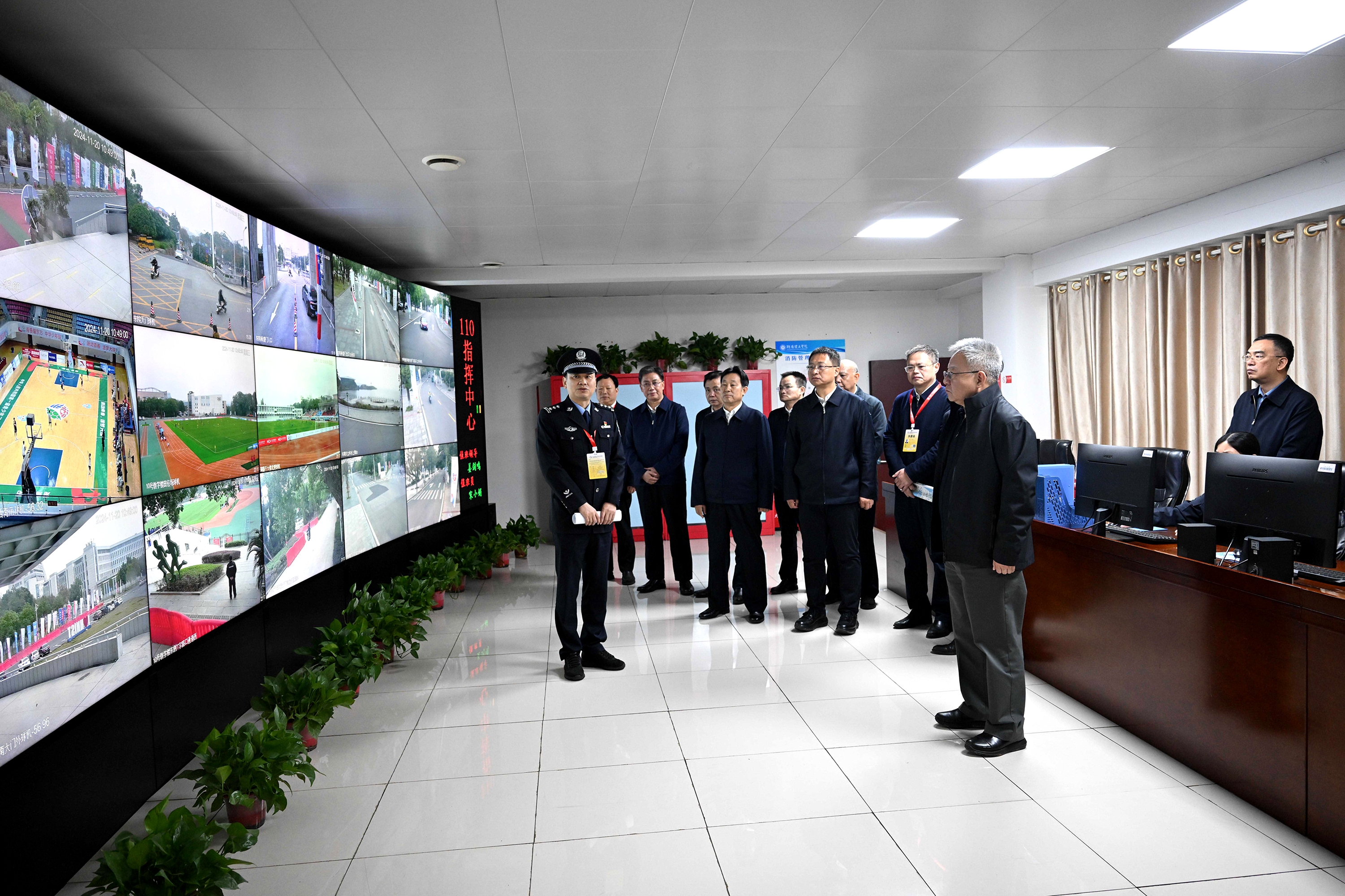 (11月20日,沈晓明来到湖南理工学院查看第一届全国青少年三大球运动会赛点安保指挥中心。)