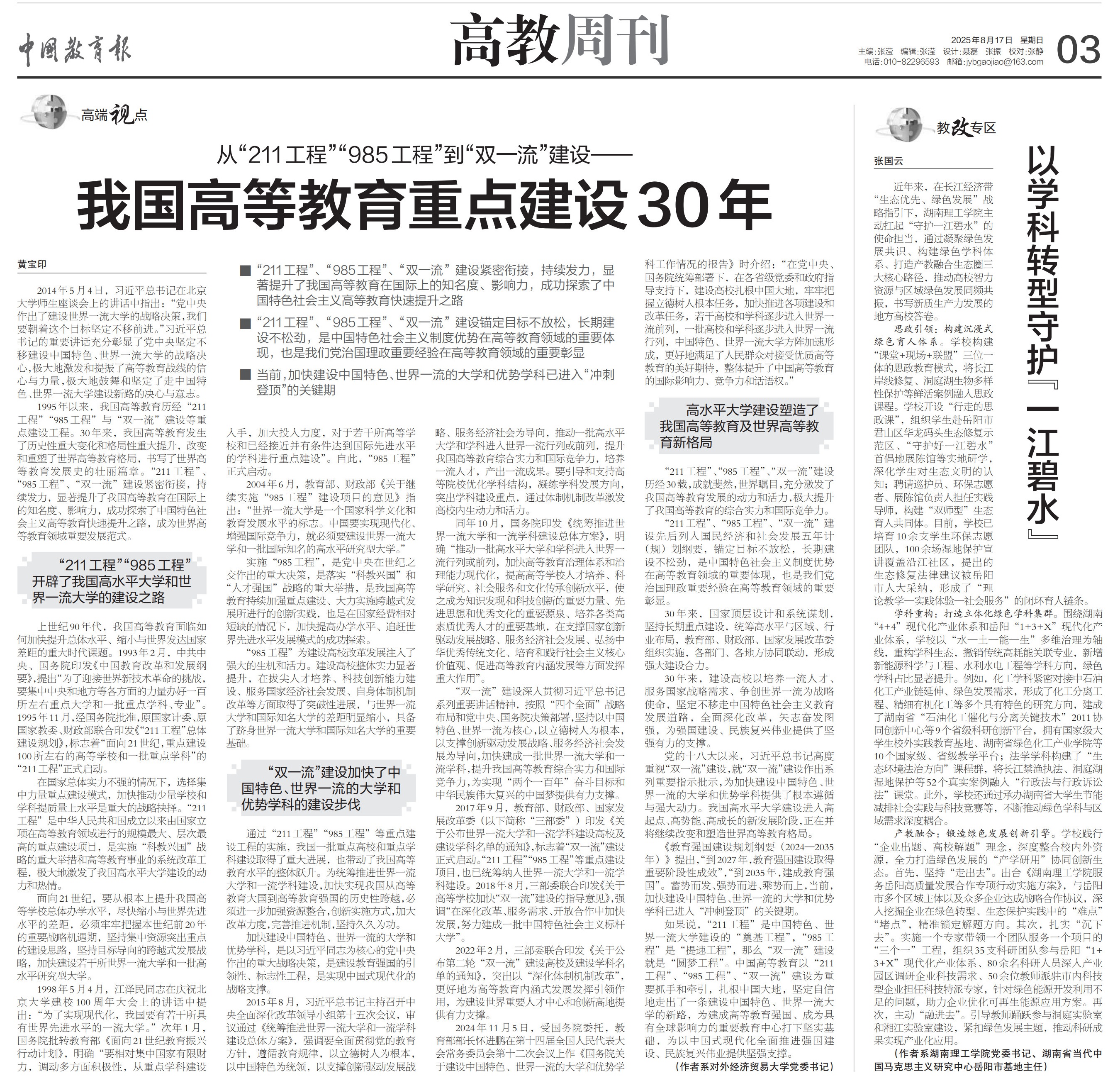 校园网讯 8月17日,学校党委书记张国云在《中国教育报》发表署名文章《以学科转型守护“一江碧水”》。
