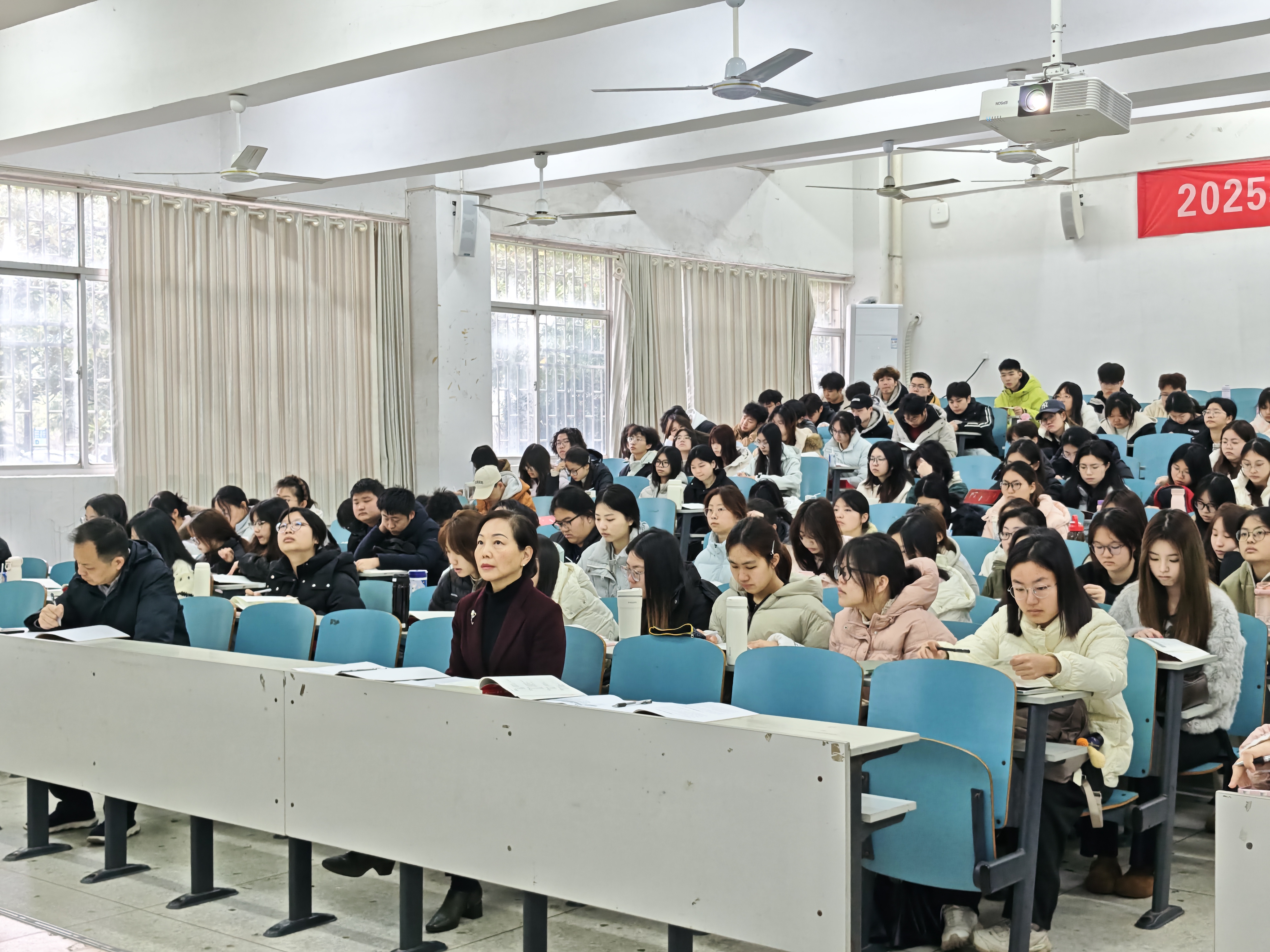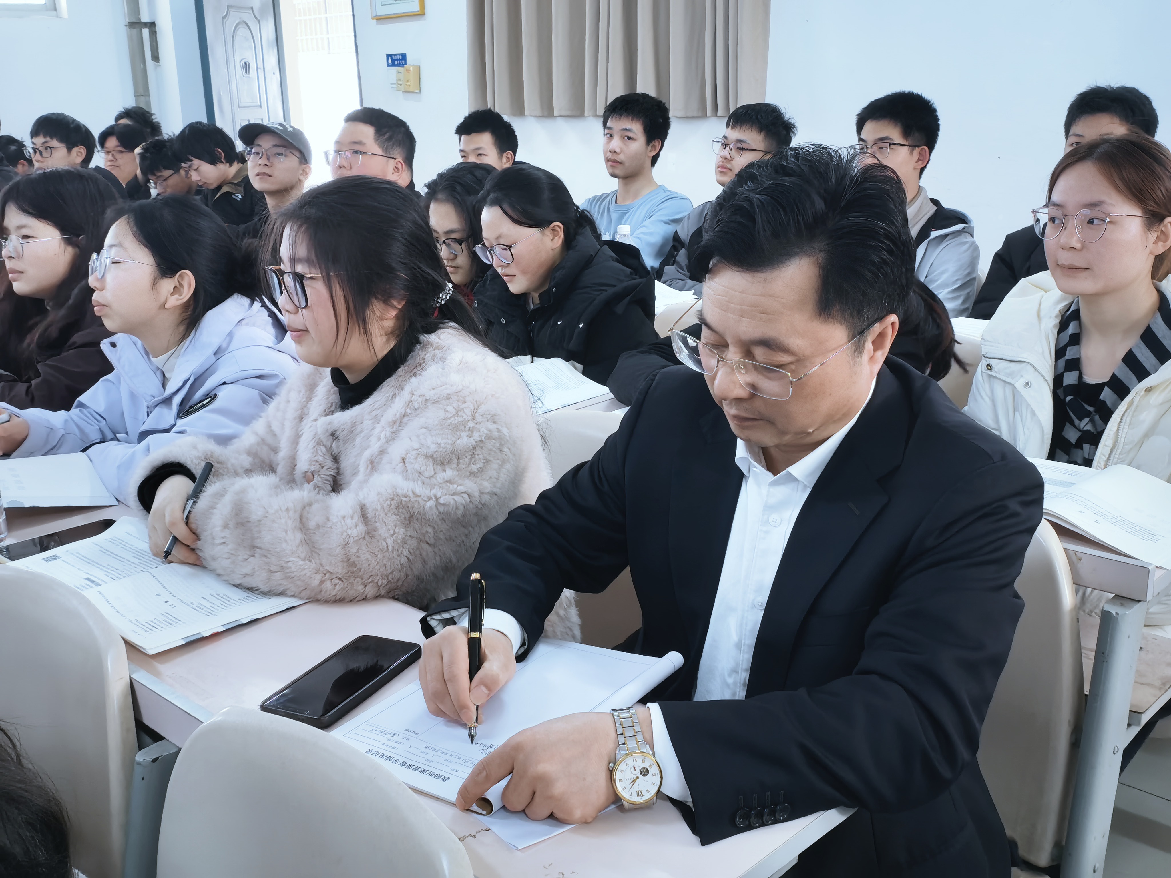 张国云在15210教室随堂听取马克思主义学院黄小珊老师讲授的《毛泽东思想和中国特色社会主义理论体系概论》课程。课后,张国云与黄小珊进行深入交流。他认为,黄老师备课充分、授课严谨,紧密结合毛泽东同志生平与关键历史节点,系统梳理和阐释毛泽东思想形成的历史条件、实践基础及不同时期经典著作,思路清晰、内容充实,并对黄老师倡导学生读原著、品经典的做法表示赞许。同时,他就教学设计与课程思政融入,提升思政课吸引力、感染力等方面提出了具体意见。他还勉励全校师生以马年实干之姿深耕课堂主阵地,以龙马精神奋楫争先、笃行不怠。