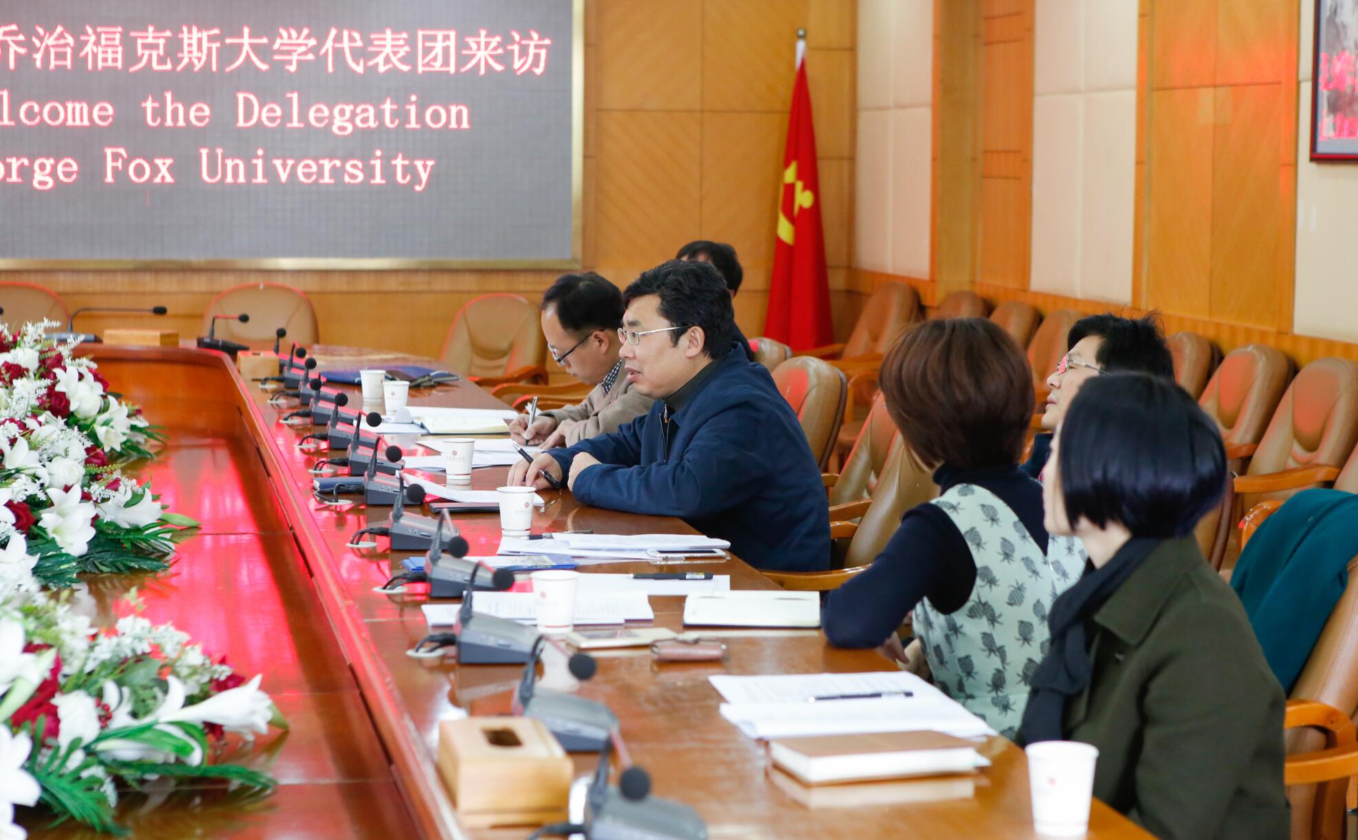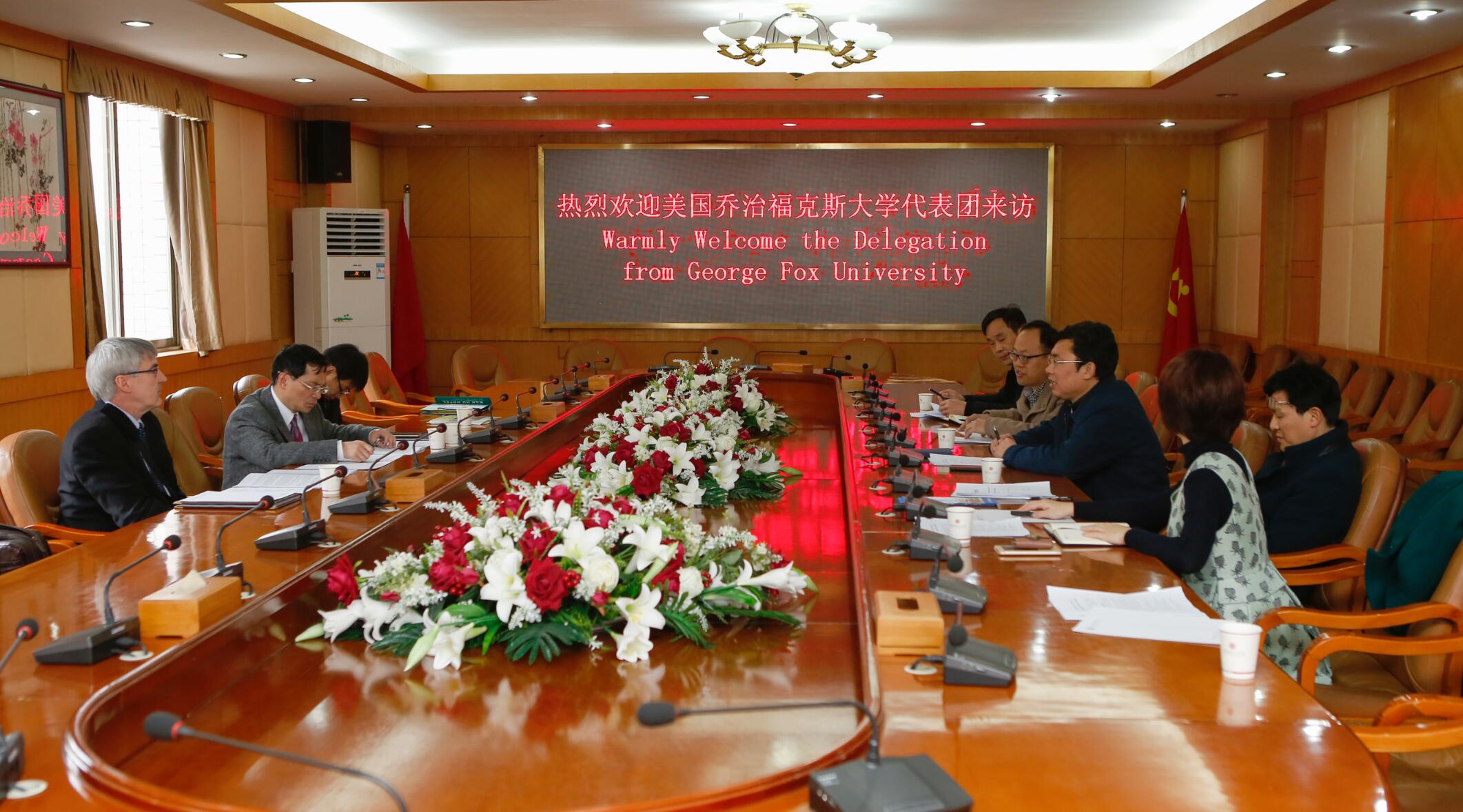 校园网讯 2月22日上午,美国乔治福克斯大学代表团来我校访问。校长卢先明热情接待了与乔治福克斯大学教育学院主任Marc Shelton博士及国际招生服务副校长彭长征博士一行。双方就首次招收基础教育管理与领导教育硕士班的合作项目以及项目实施时间、入学要求、学费、毕业论文、毕业条件等内容进行了具体商议,并就继续拓展合作培养项目及具体合作形式进行了深入探讨。学校国际交流处、研究生处、信息中心相关负责人参加。