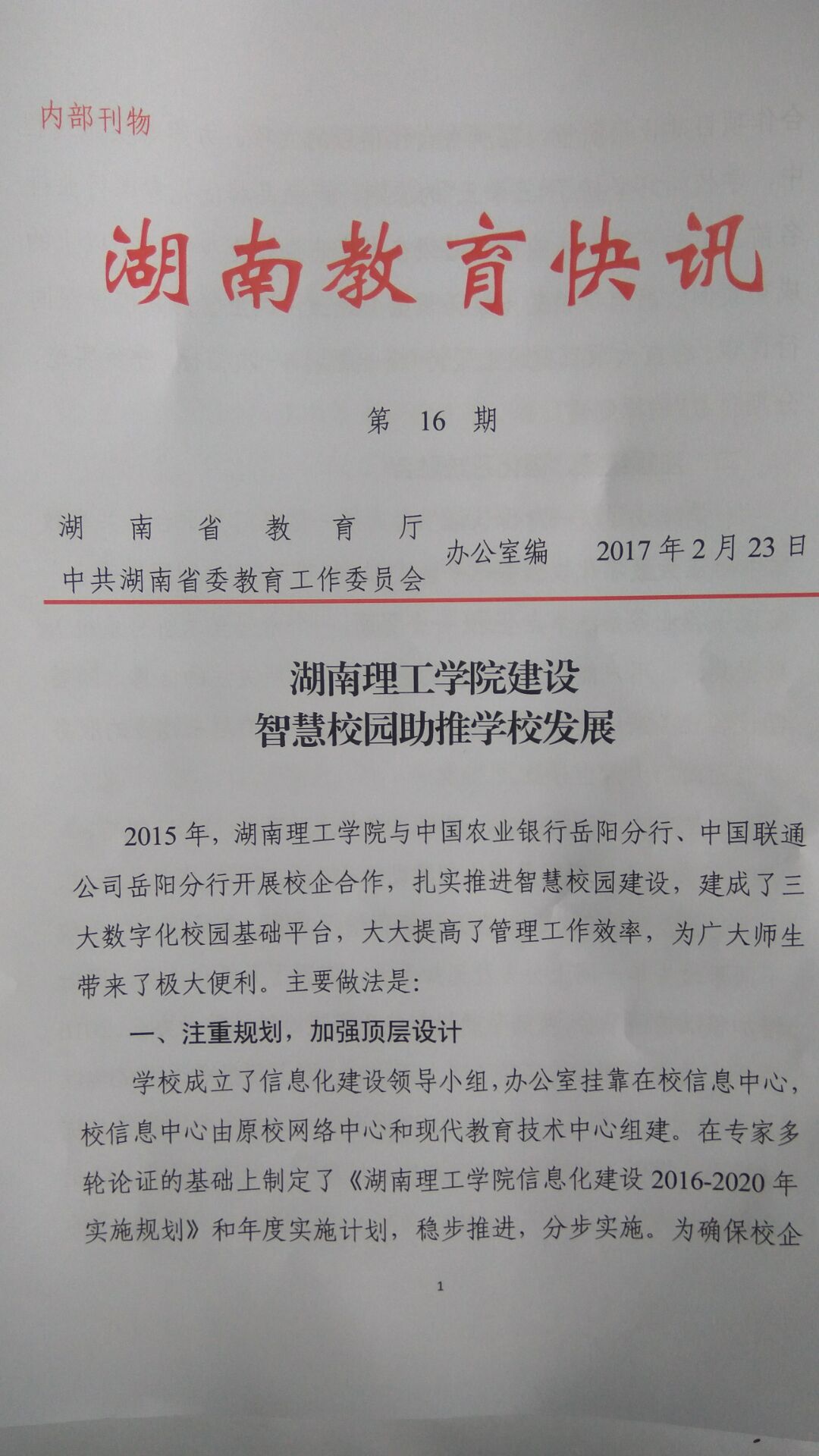 校园网讯 2月23日发行的《湖南教育快讯》以《湖南理工学院建设智慧校园助推学校发展》为题,对学校智慧校园建设工作进行了专题推介。