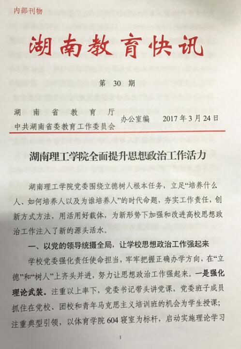 校园网讯 “湖南理工学院党委围绕立德树人根本任务,立足“培养什么人、如何培养人以及为谁培养人”的时代命题,夯实工作责任,创新方式方法,用活用好载体,为新形势下加强和改进高校思想政治工作注入了新的源头活水。”3月24日,2017年第30期《湖南教育快讯》以《湖南理工学院全面提升思想政治工作活力》为题,对学校思想政治工作经验予以了推介。