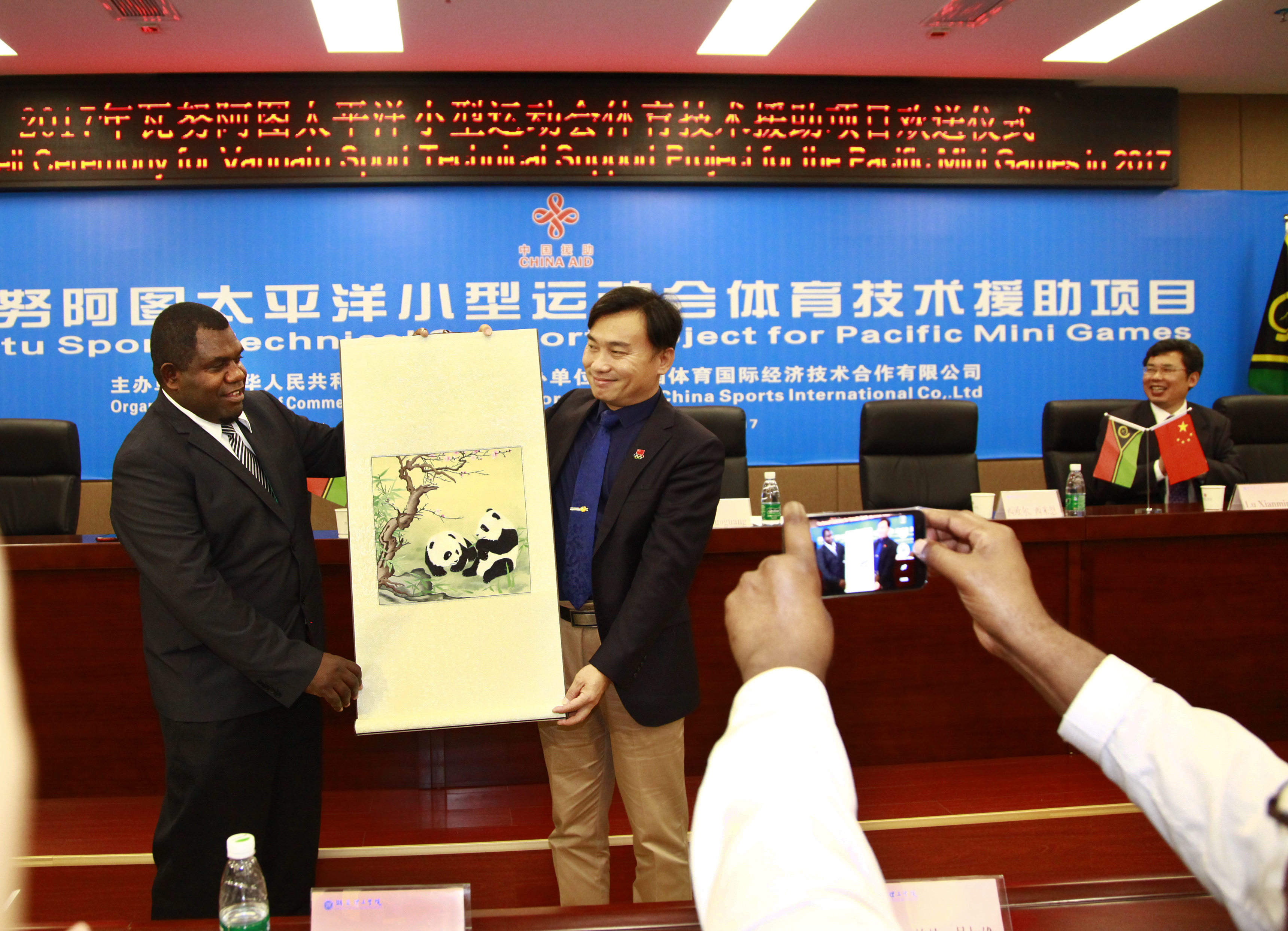 欢送仪式后,中方代表吕国光为瓦努阿图体育代表团赠送了具有中国特色的精美礼品,全体人员合影留念。