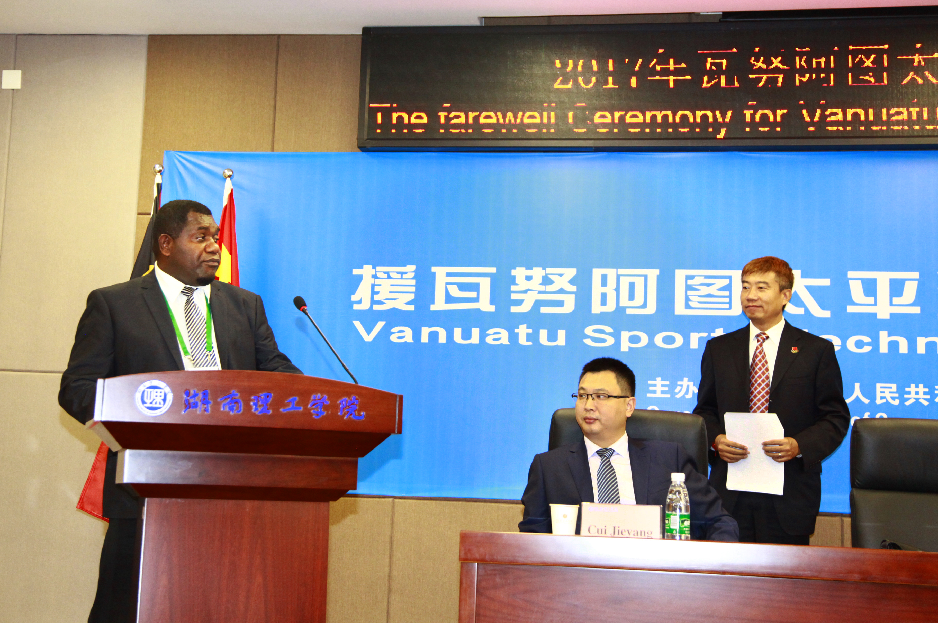 欢送仪式上,全体成员共同观看了瓦努阿图国运动员在我校训练的记录视频,吕国光对圆满完成来华训练的瓦努阿图国运动员表示祝贺,并预祝他们在太平洋小型运动会上取得优异成绩。Hon Seule Simon在致辞中表示对此次瓦努阿图国运动队的接待工作十分满意,感谢中方工作人员所做的一切努力,并祝愿两国友谊地久天长。