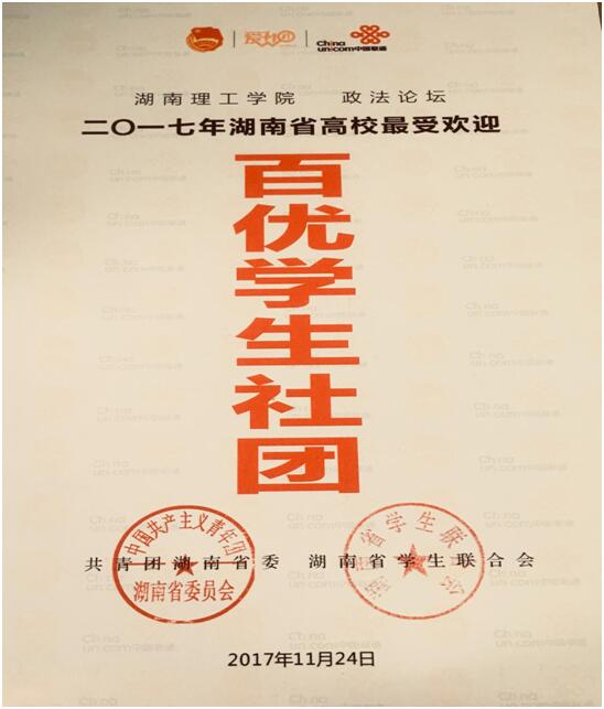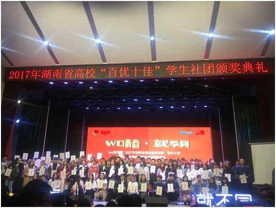 校园网讯 由共青团湖南省委、湖南省学联共同主办,中国联通湖南省分公司协办的“WO爱社团”2017年度湖南省高校“百优十佳”学生社团网络推选活动颁奖典礼于11月24日在中南林科大举行。政法学院的“政法论坛”喜获全省高校最受欢迎“百优十佳”学生社团评选的“百优”社团称号。“政法论坛”负责人、2016法学专业学生辛佩齐代表政法学院登台受奖。