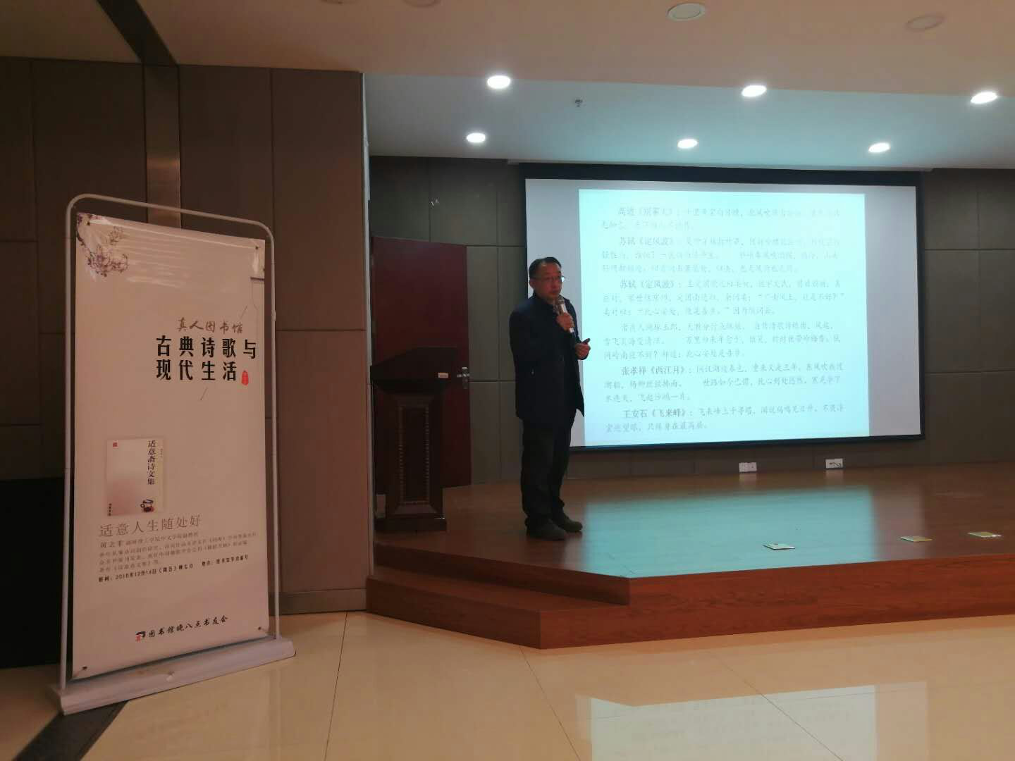 为了提高同学们对古典诗歌的热爱,黄老师从“学习古典诗歌是传承文化的重要方式之一”、“古典诗歌的现代意义”、“鼓励人们向上与向善的力量源泉”、“与古典诗歌相伴,诗意地栖居”这四点为大家解读。通过列举生动形象的例子,让观众明白“书画棋琴诗酒花”是人生标配,诗歌有滋润心灵,陶冶情操作用。生活中应有书和书房,要成为颜值与诗意并存的人。