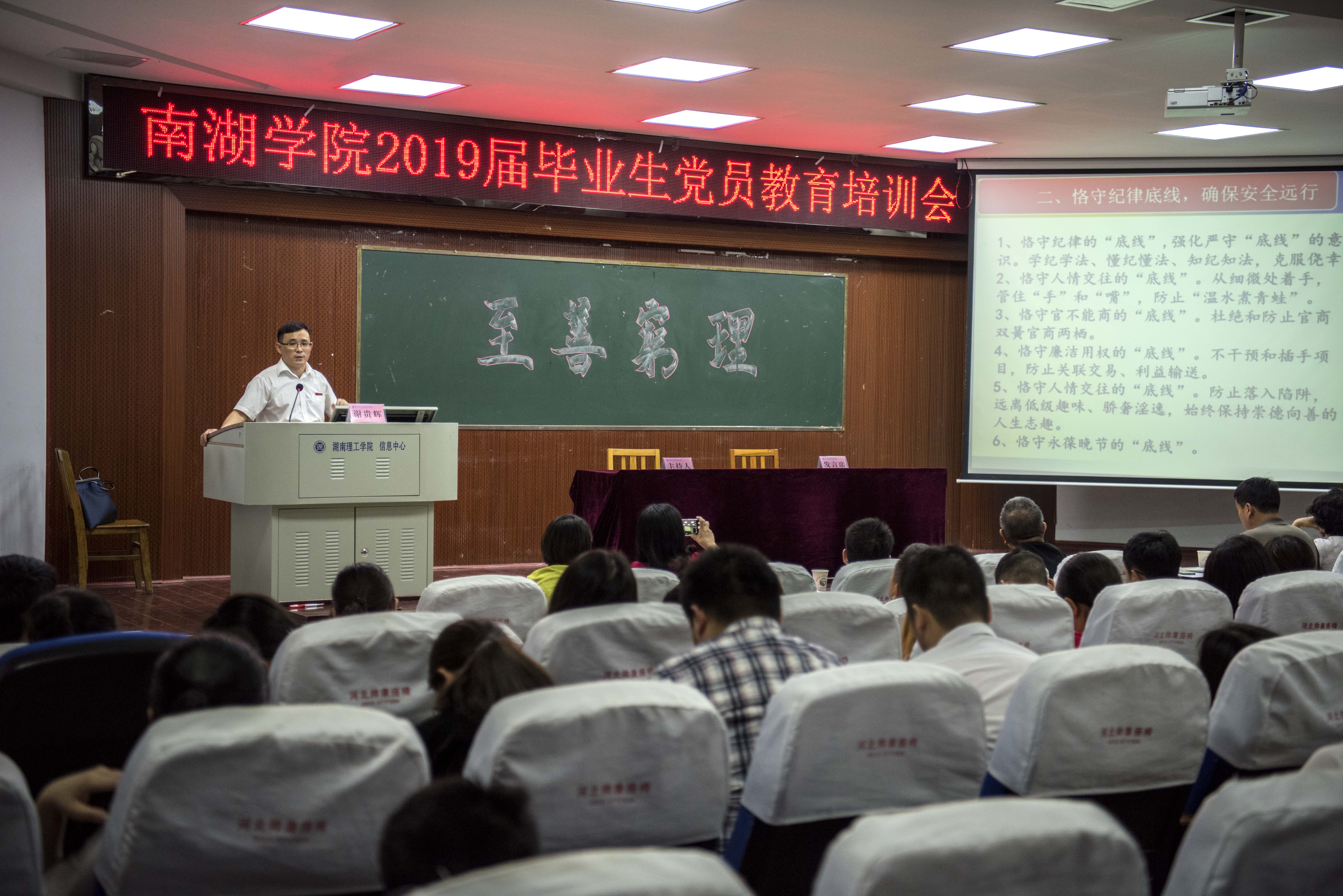 校园网讯 5月28日下午,南湖学院2019届毕业生党员教育培训会在物电楼学术报告厅举行。党委委员、纪委书记谢贵辉应邀为学院2019届毕业生党员作专题辅导讲座。全体院领导、学校纪委和监察处相关领导干部、各系党总支书记、学生支部书记、毕业班辅导员、全体毕业生党员近200余人参加教育培训会。