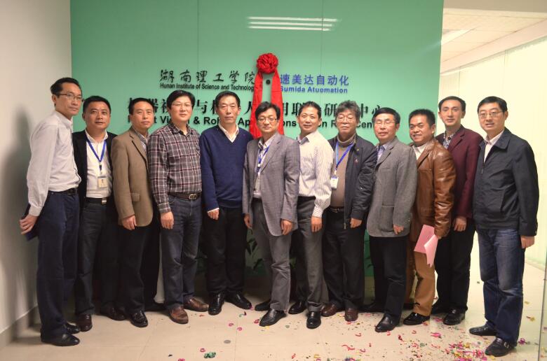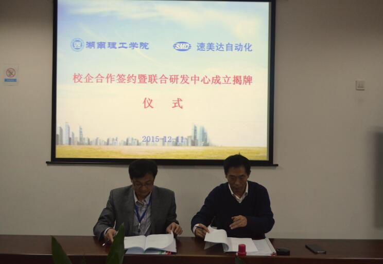 仪式上,邱绍雄代表学校与公司总经理李明亮签订了湖南理工学院——速美达自动化有限公司联合组建机器视觉与工业机器人应用研发中心合作框架协议。信息学院博士郭龙源作为项目负责人与公司签订了手机液晶屏光学检测系统技术开发合同。随后邱绍雄与李明亮等一起为研发中心揭牌。