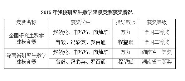 校园网讯 近日,全国研究生数学建模竞赛组委员会公布了“中关村青联杯”第十二届全国研究生数学建模竞赛评审结果,我校选送的2支代表队双双获得全国二等奖,这是继他们此前在湖南省首届研究生数学建模竞赛中喜获省级一、二等奖后的又一重大突破。