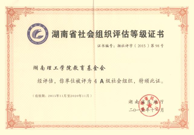 校园网讯 11月17日,湖南省社会组织评估会议暨负责人培训班在长沙举行,会议宣读了湖南省民政厅对评估为3A以上等级全省性社会组织授牌的决定,我校教育基金会被评估为4A等级,我校教育基金会秘书长李赴军参加会议并接牌。
