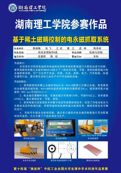校园网讯 11月20日,第十四届"挑战杯"中航工业全国大学生课外学术科技作品竞赛决赛在广州市广东工业大学圆满落幕,我校学生参赛的科技发明作品《基于稀土磁畴控制的电永磁抓取系统》荣获全国二等奖。