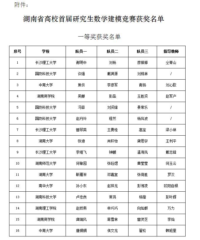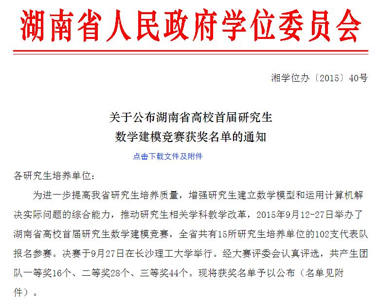 校园网讯 10月28日,湖南省学位办发文公布2015年全省高校首届研究生数学建模竞赛结果,我校研究生代表队荣获一等奖一项、二等奖一项。