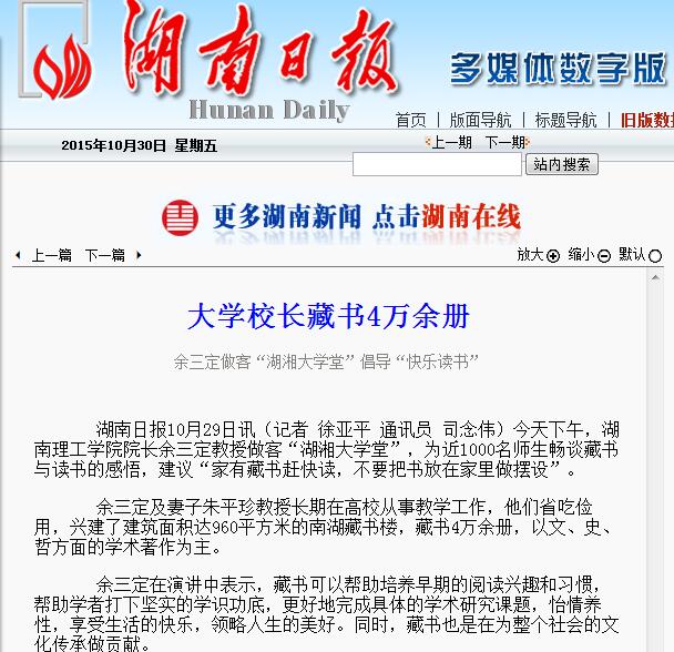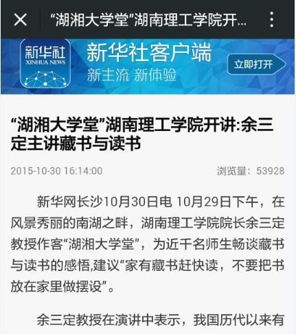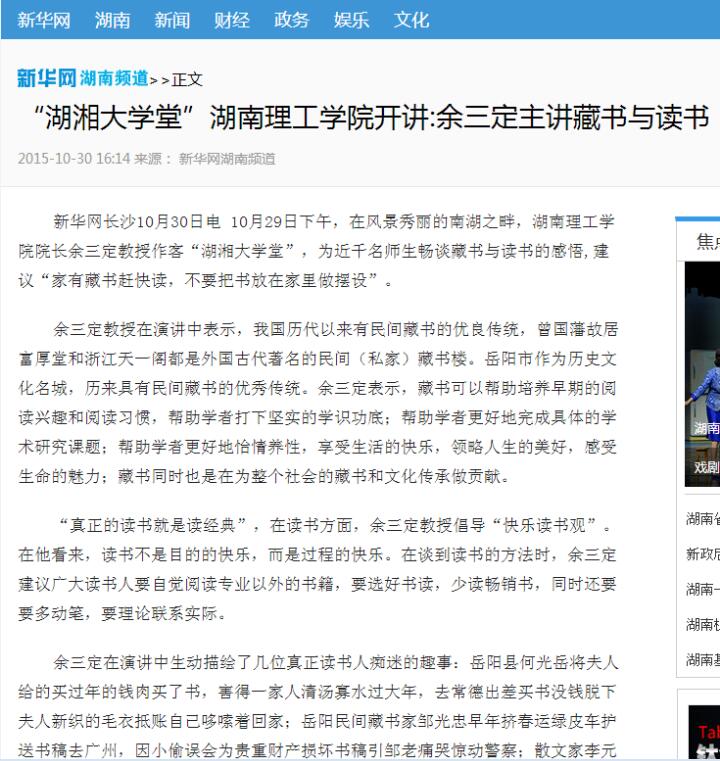 多家媒体关注余三定校长主讲“湖湘大学堂”