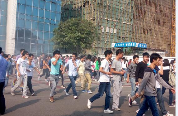 校园网讯 10月24日上午,伴随着滚滚浓烟和急促的警笛声,15栋教学楼里冲出大群学生。“快跑!快跑!”的喊声阵阵,他们弯着腰,用手或湿纸巾捂住口鼻,紧紧跟着前面同学的步伐,以最快的速度有序地逃到安全空旷的地点——云梦广场。消防车也火速赶到了现场,当即开始引水救火。这到底是怎么回事呢?