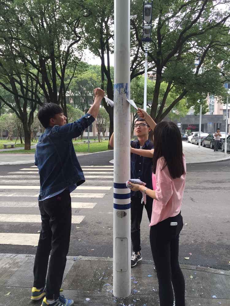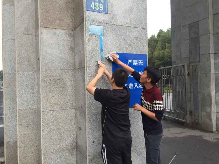 本次义务劳动的区域为希望门至东院田径场,包括除掉墙面小广告、打扫道路卫生和清洁路灯杆。经过近2小时的努力,这一区域被打扫得焕然一新。(新闻学院 学生记者/张帅)