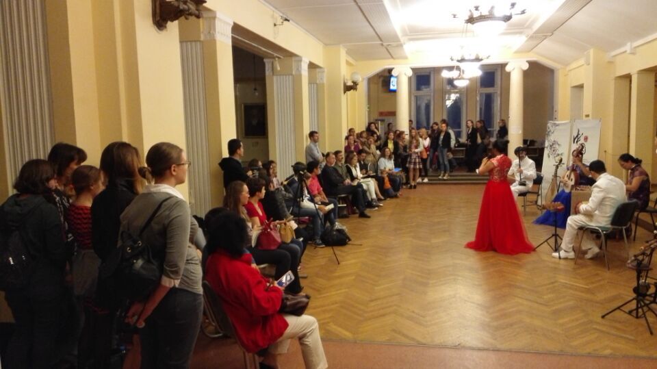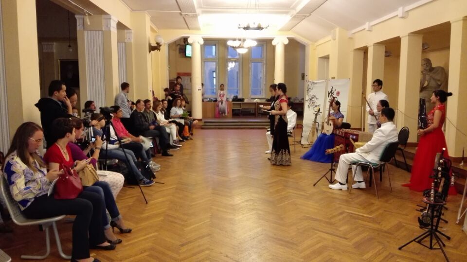校园网讯 莫斯科当地时间22日18:30(北京时间22:30),在俄罗斯国立人文大学剧场内,随着一曲湖南桑植民歌《马桑树儿搭灯台》的旋律响起,“中俄青年友好交流年”中国文化艺术展演的序幕正式拉开。这个由我校民乐团带来的中国传统乐曲表演,赢得在场观众的热烈掌声。